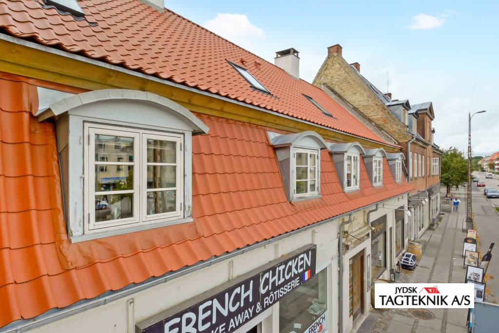 Butiksejendom fik lagt nyt tegltag, ejendommen fik også monteret nye kviste samt nye velux ovenlysninger.