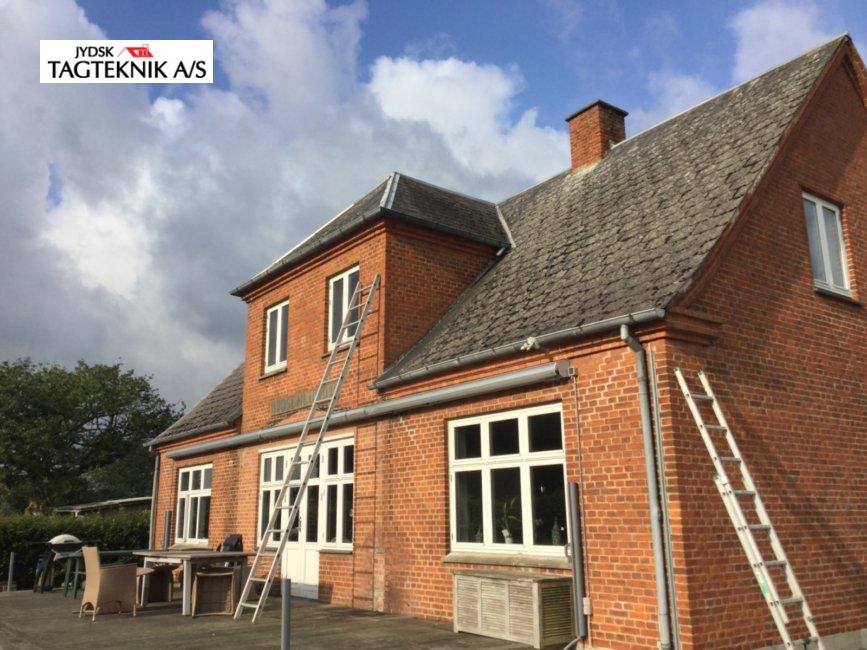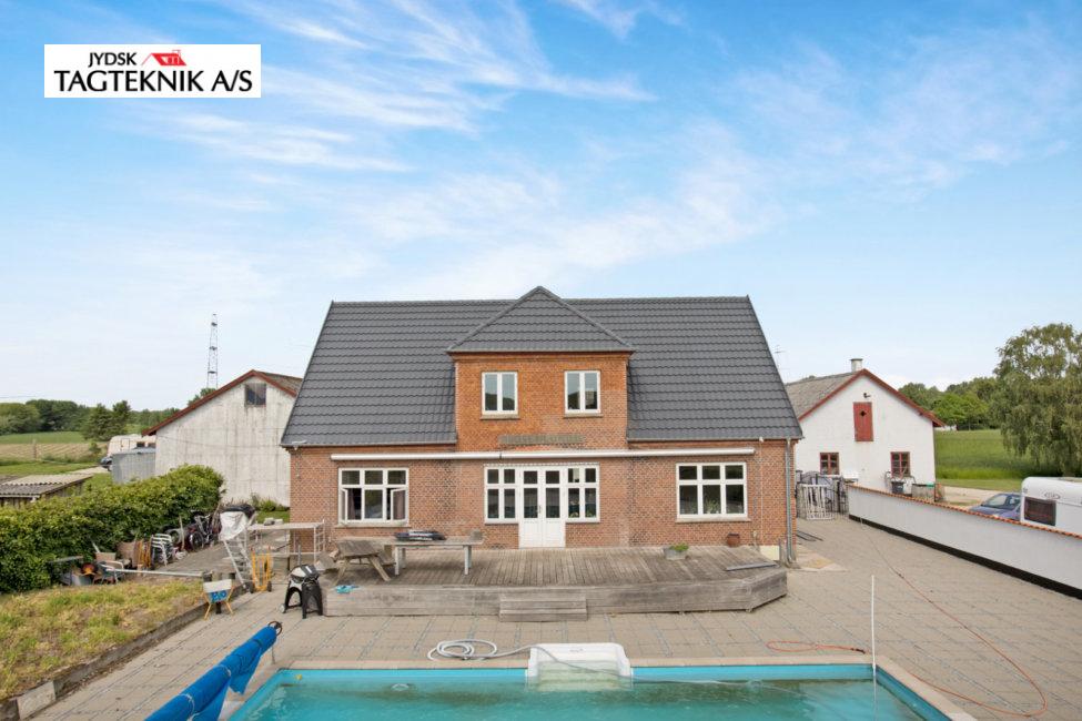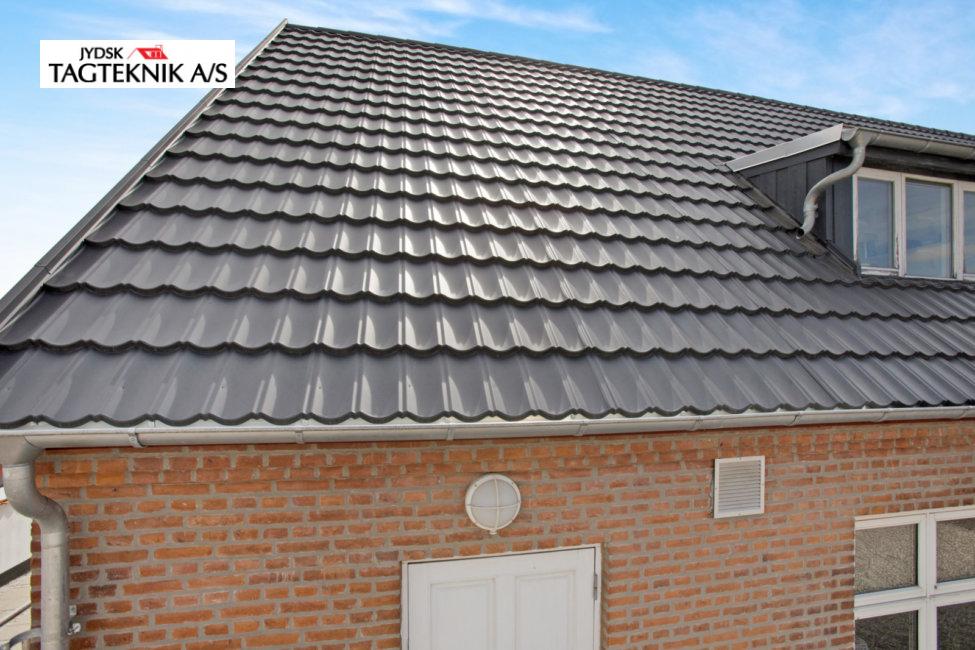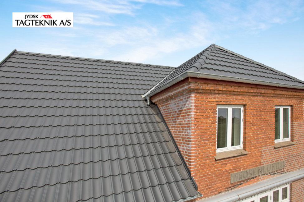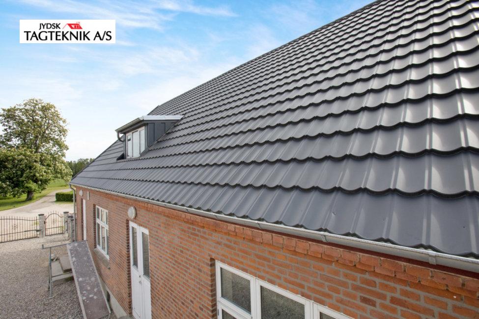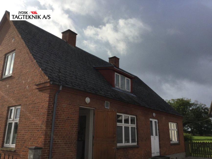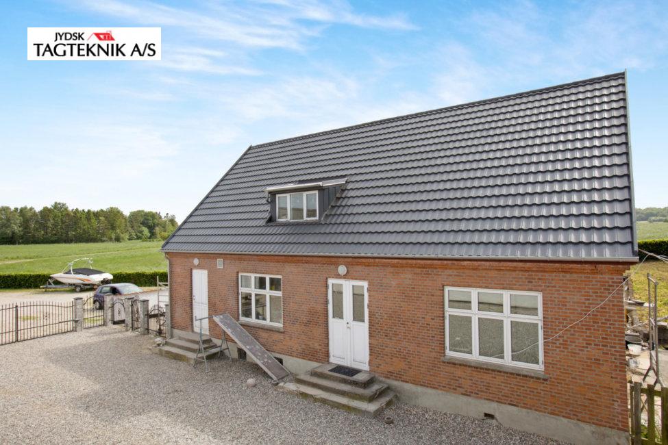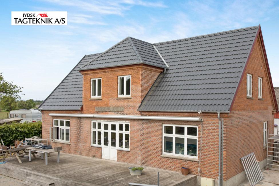 Denne ejendom i Helsingør, fik lagt nyt Decra Grafit tag, samt nyt pap på de eksisterende kviste. Vi monterede også nye zink tagrender.