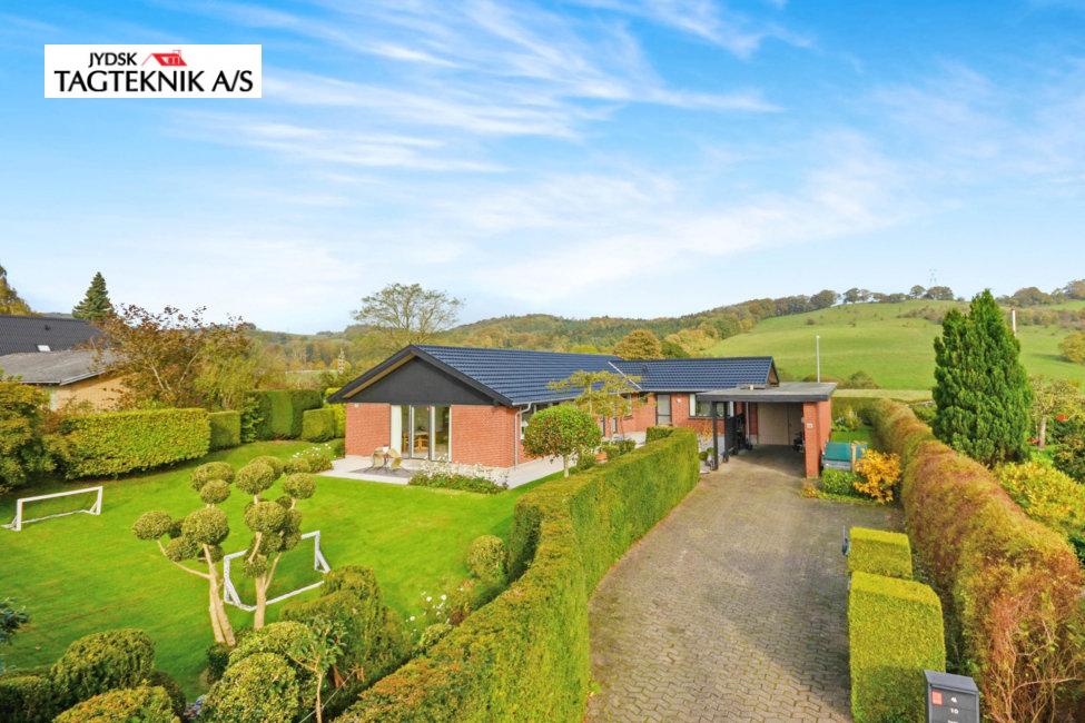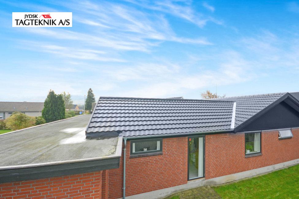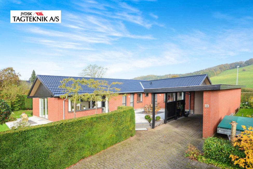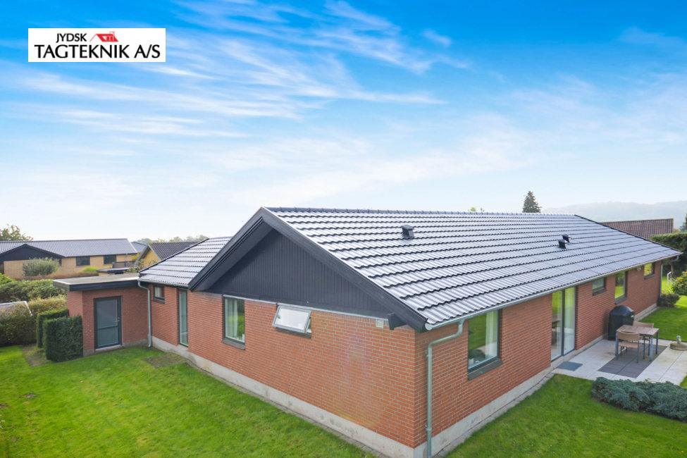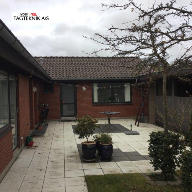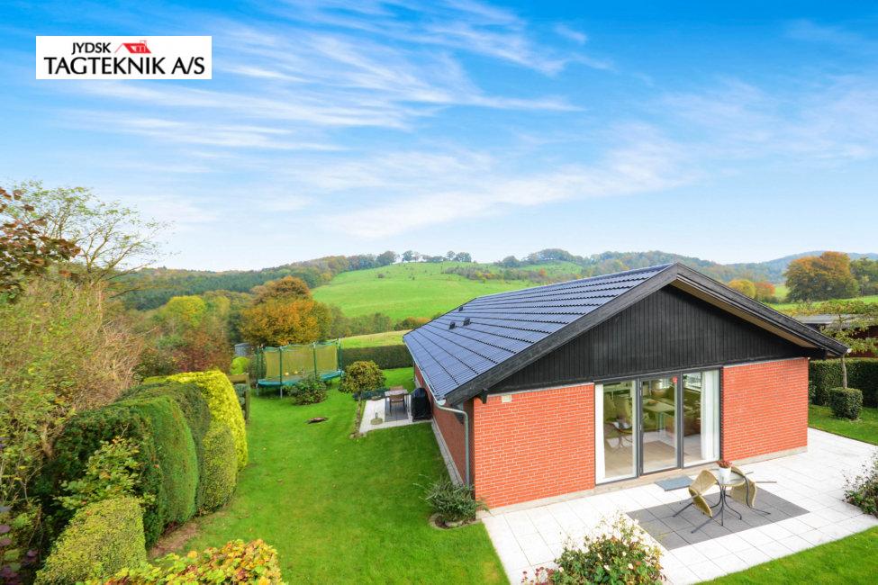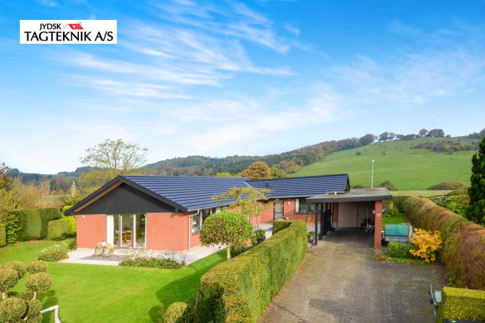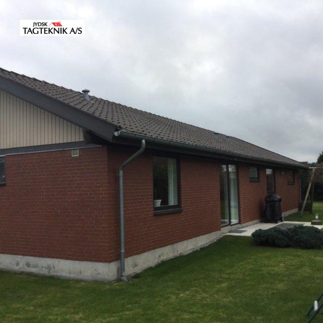 Med udsigt til skov og skønne marker, skiftede vi det gamle tegltag ud med lækkert Decra sort mat. Vedligeholdelses frie sternbrædder og vindskeder kom op, samt nye zink tagrender
