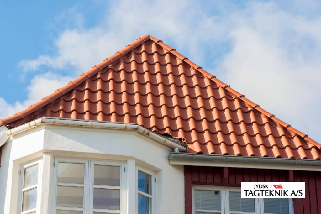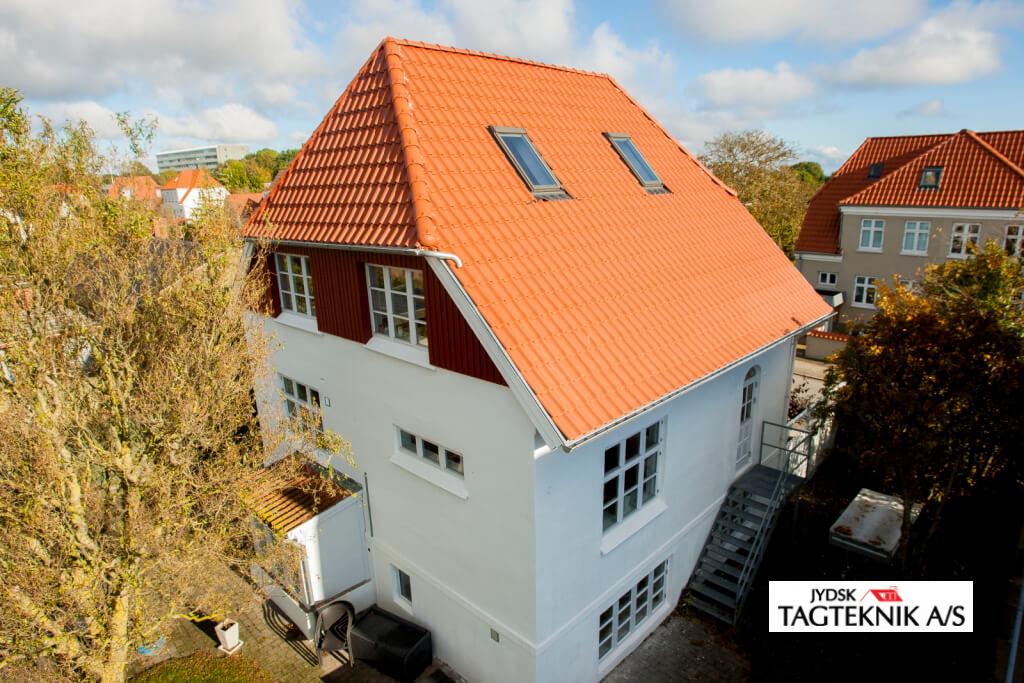Da taget på denne smukke ejendom skulle skiftes, faldt valget på et naturrødt tegltag. Samtidig blev der monteret nye zinktagrender.