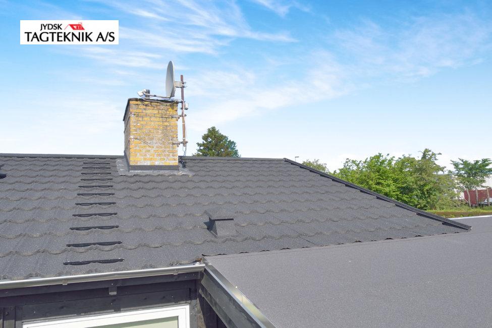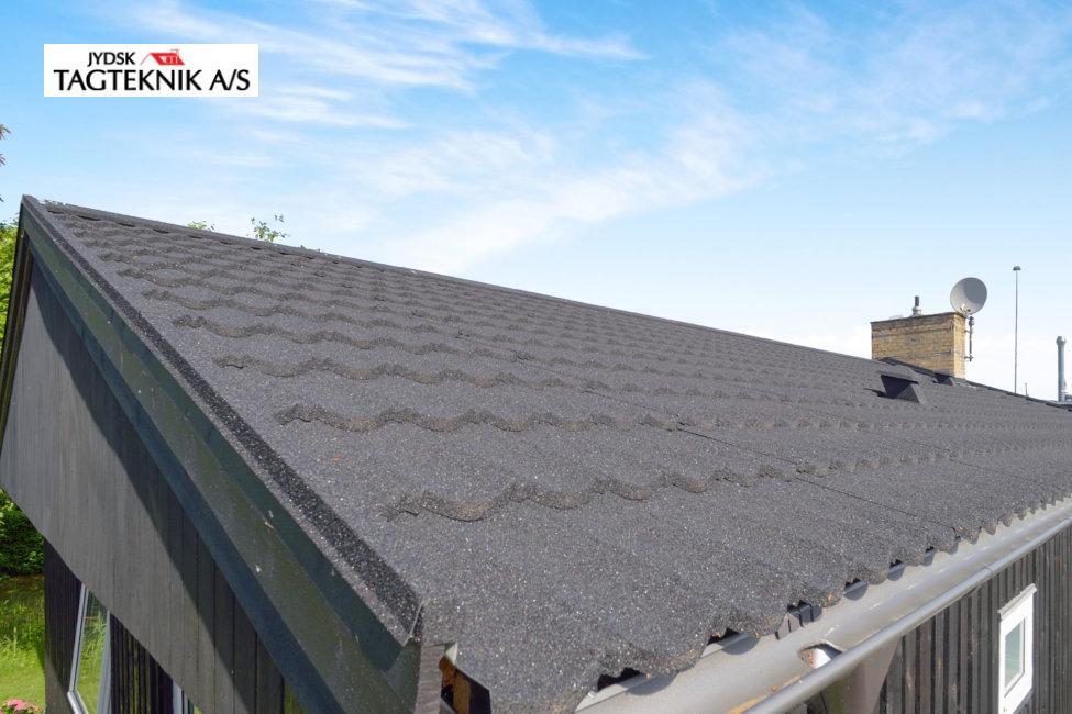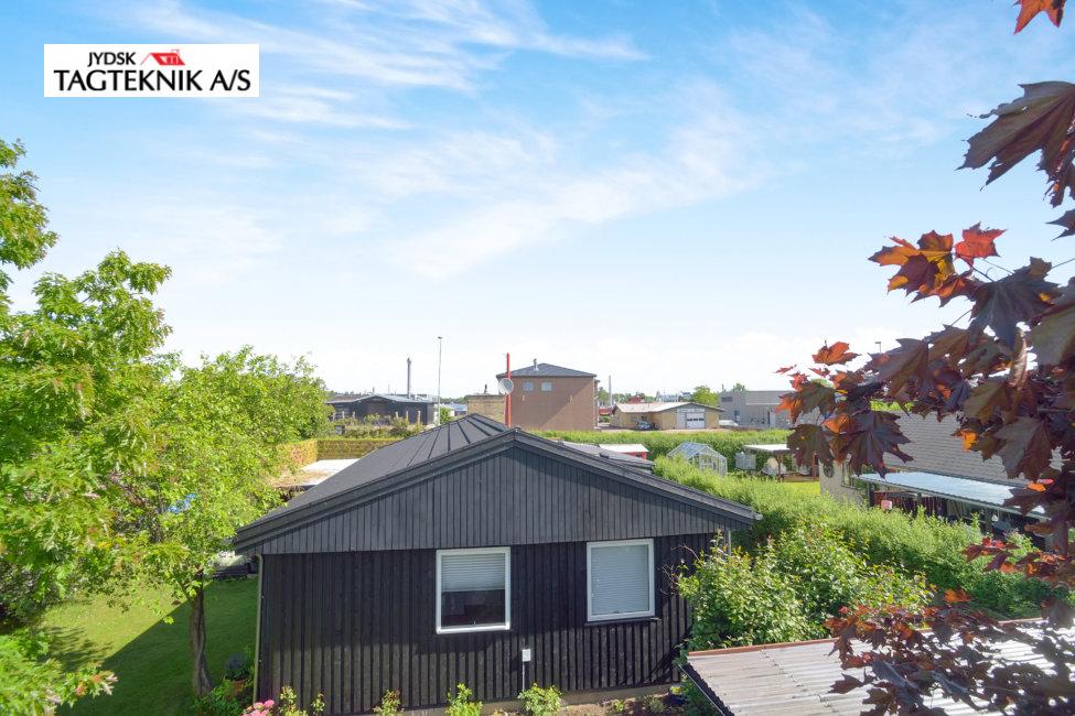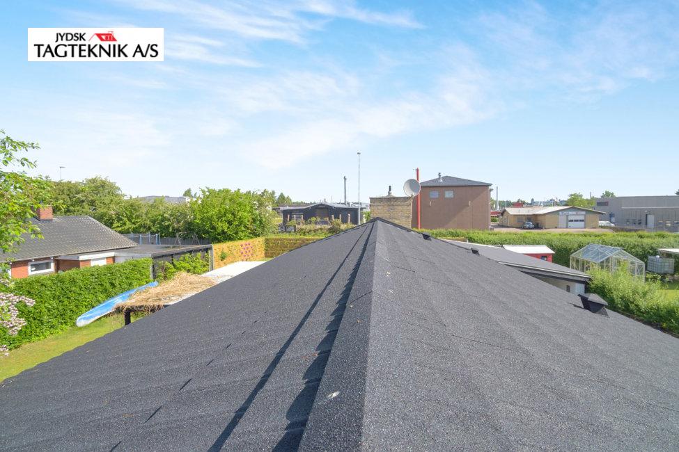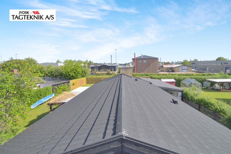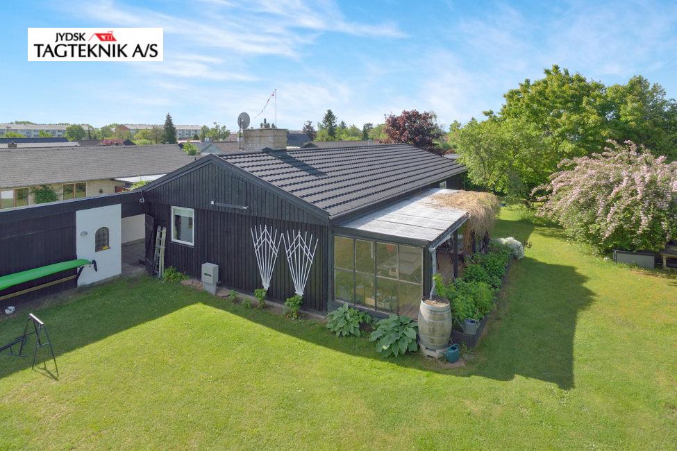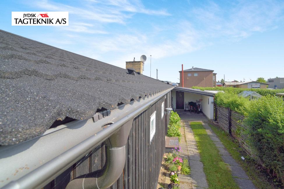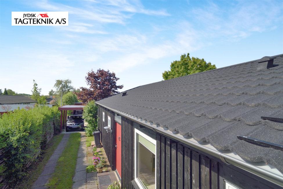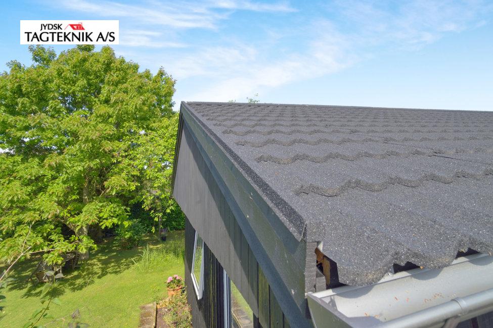 Huset i Farum fik lagt et nyt Decra Classic tag på det eksisterende eternittag, huset fik også monteret nye metaltagrender, samt sortmalede sternbrædder og vindskeder.
