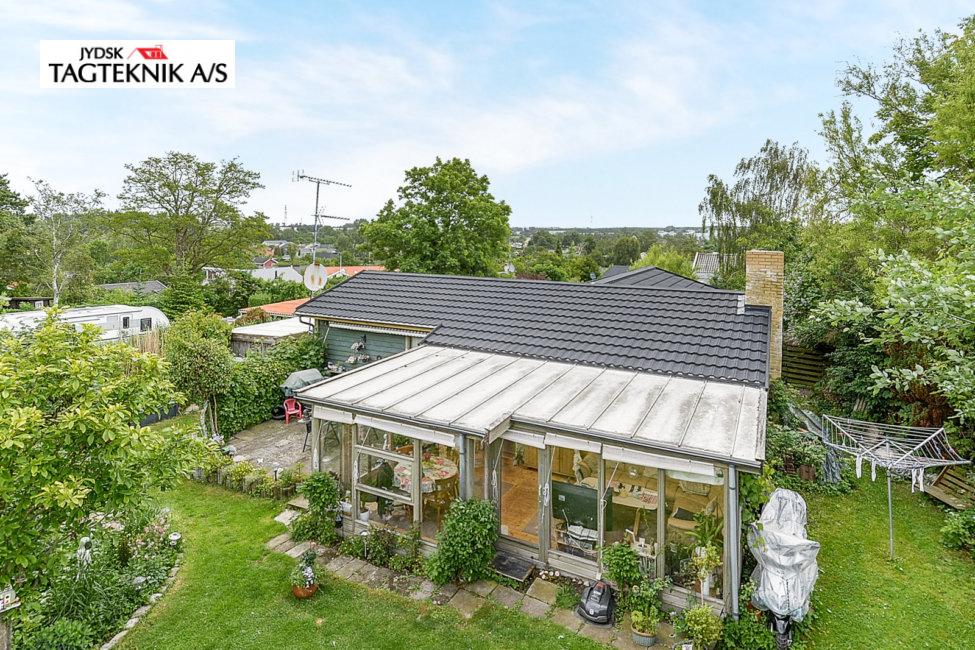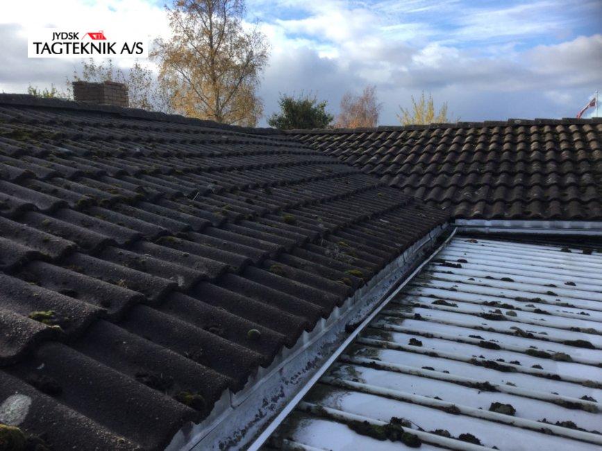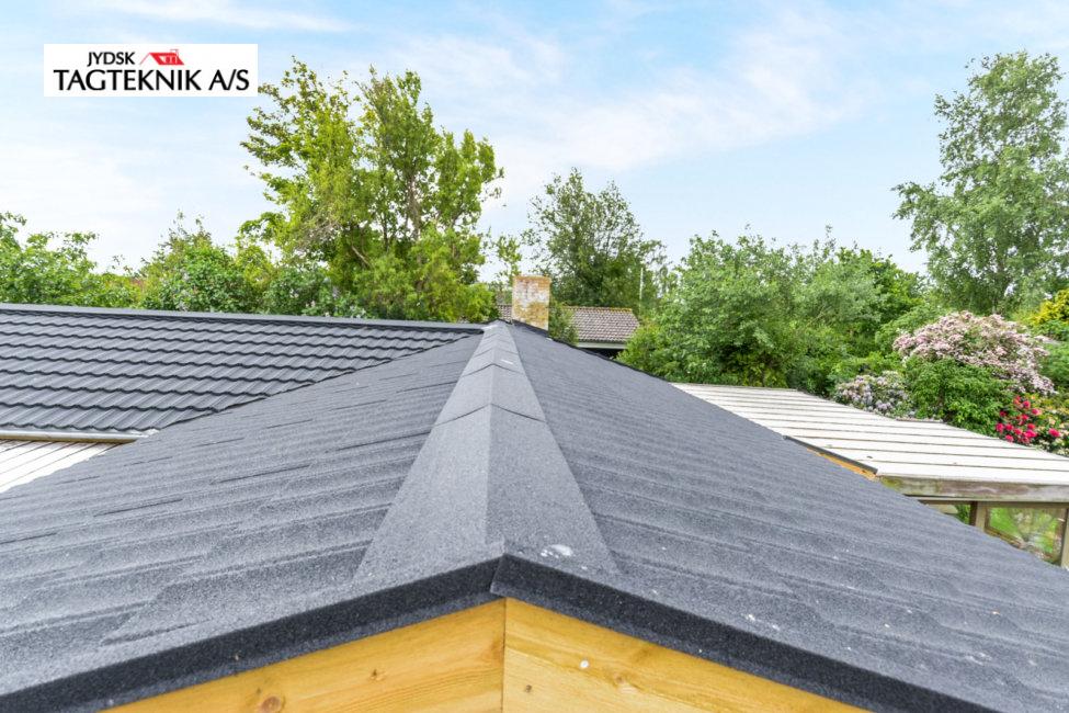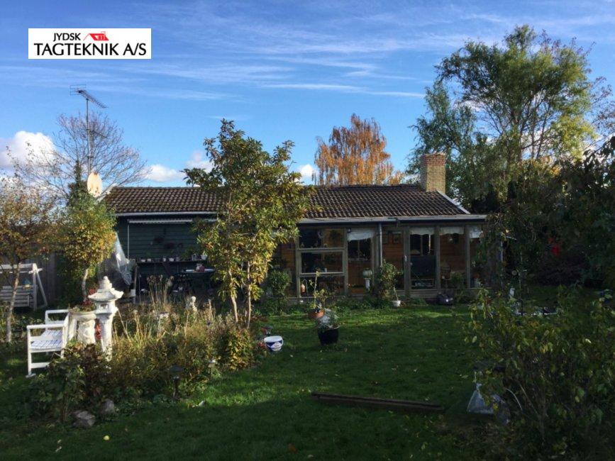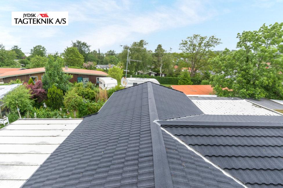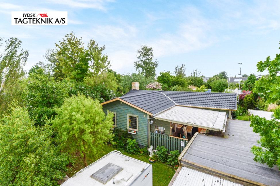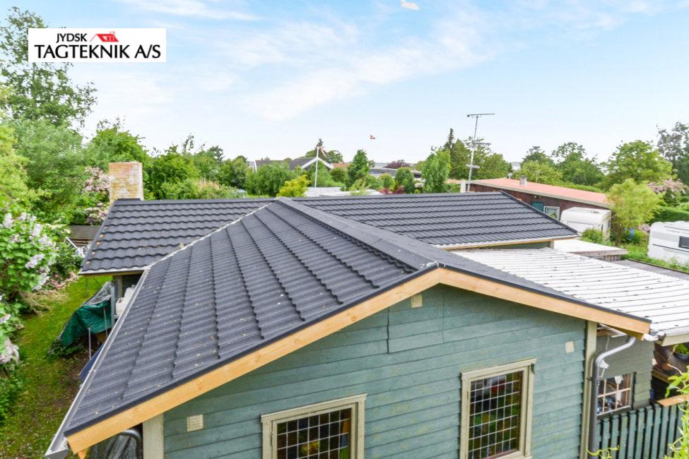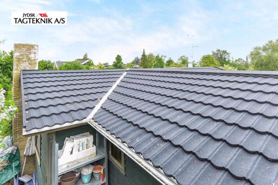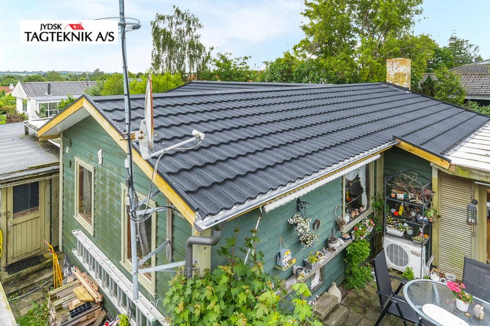 På dette fine træhus i Jyllinge, fjernede vi det gamle betontegl, og monterede nyt sort Decra Classic. Udhæng, stern og vindskeder er skiftet. Huset fik også monteret nye metaltagrender.