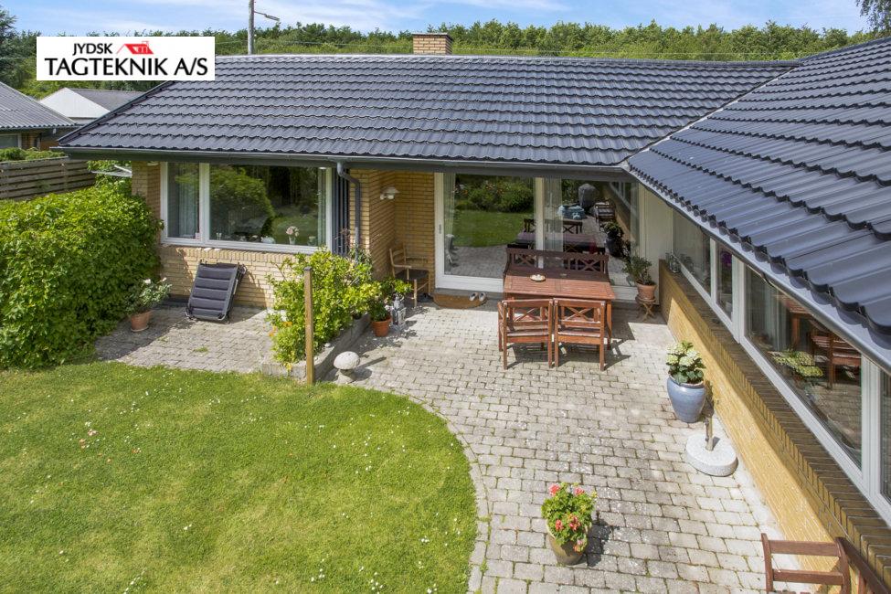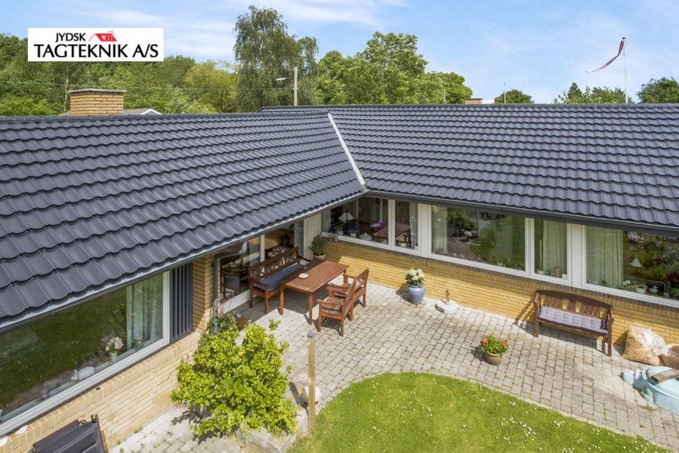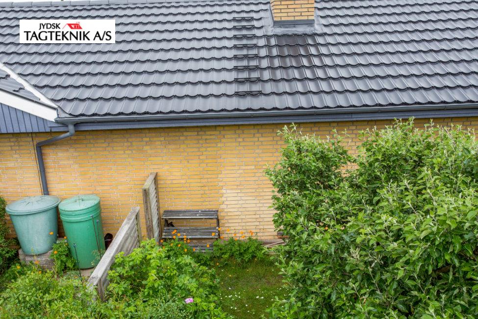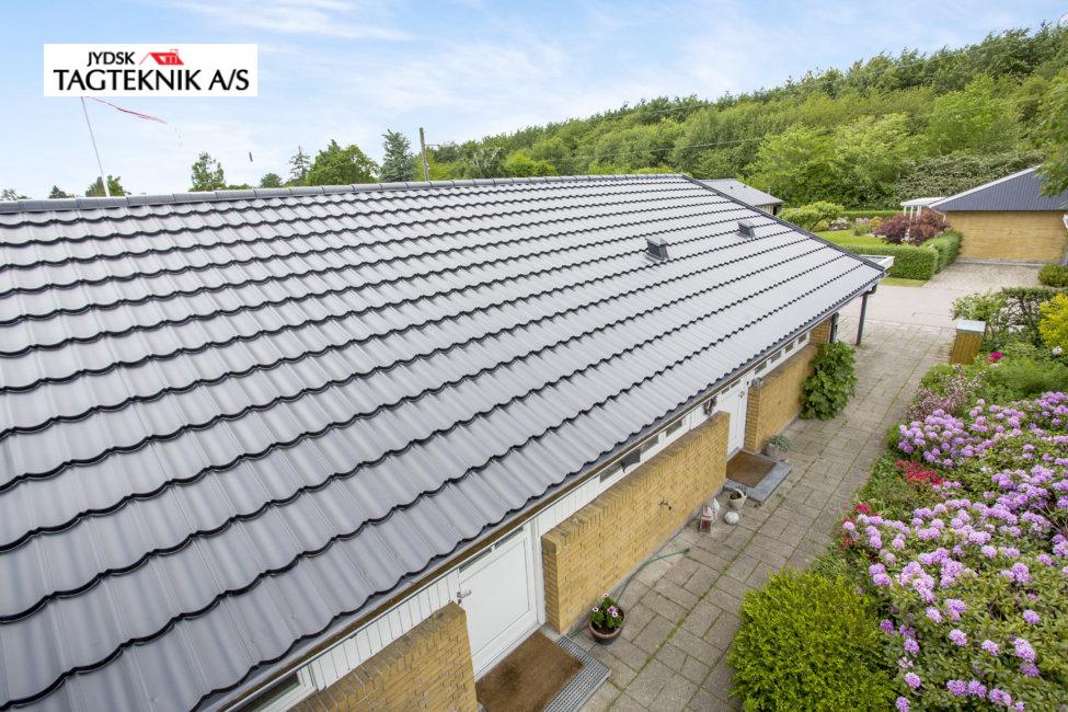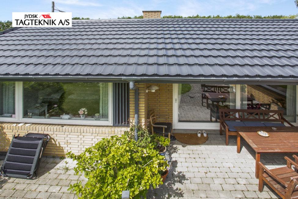 Huset i Albertslund, fik lagt nyt sort mat Decratag. Vi monterede Aluminiums skotrender, og PVC Icopal tagrender i sort.