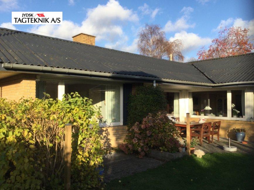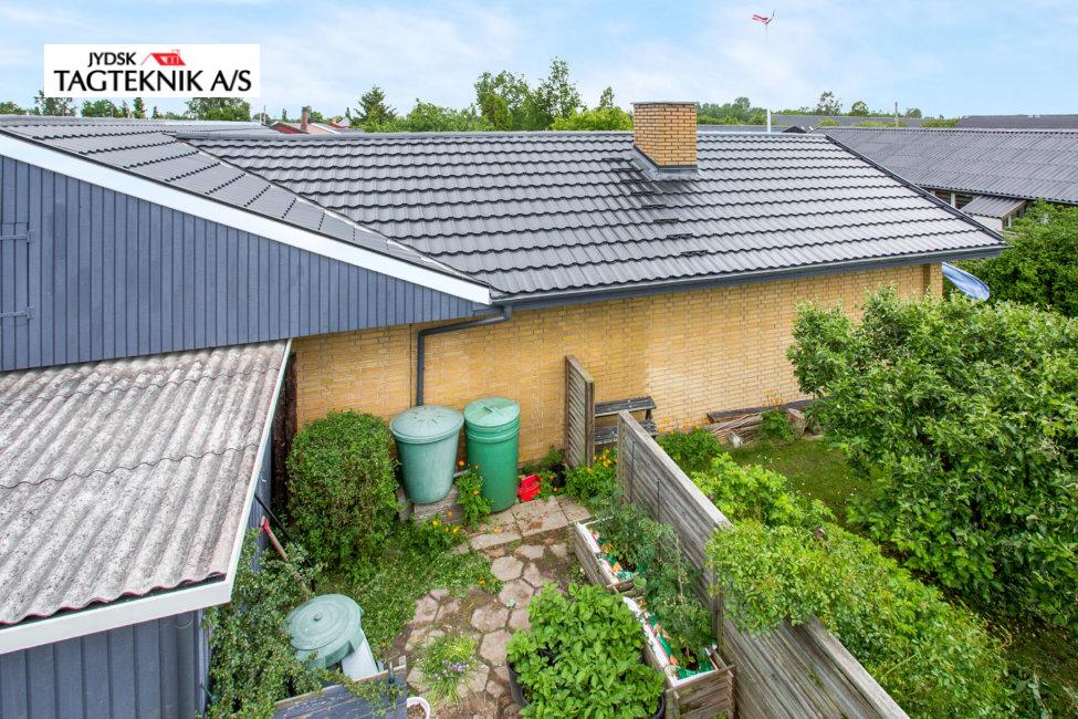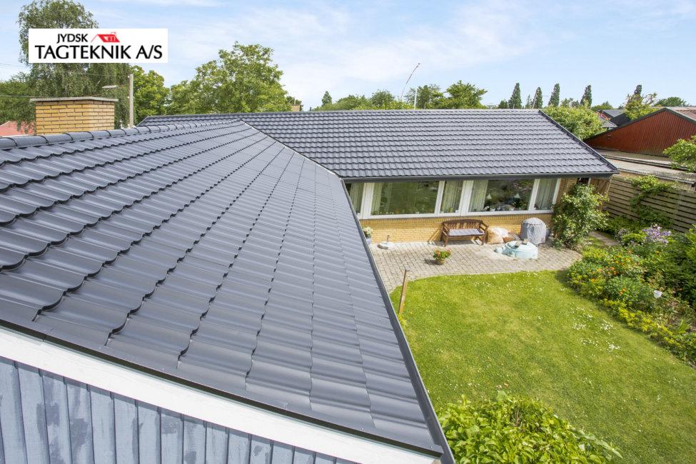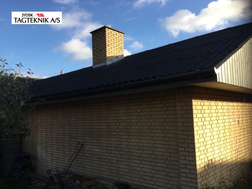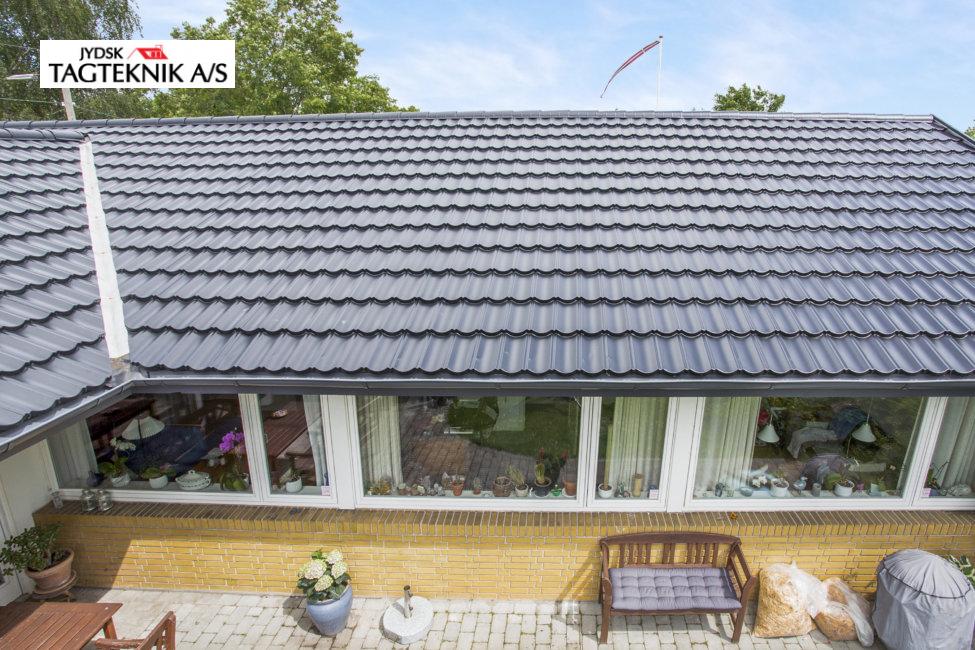 Huset i Albertslund, fik lagt nyt sort mat Decratag. Vi monterede Aluminiums skotrender, og PVC Icopal tagrender i sort.
