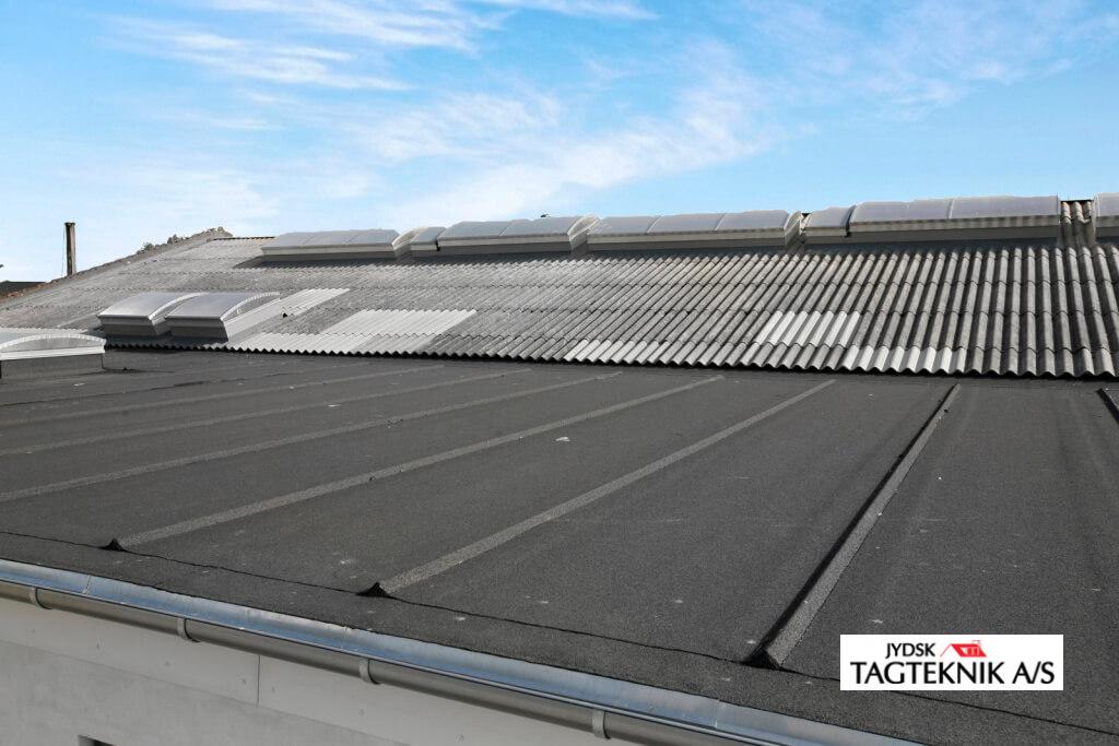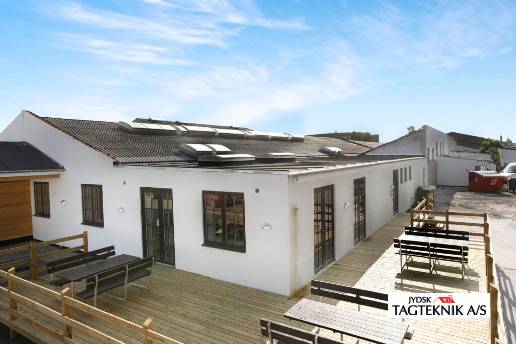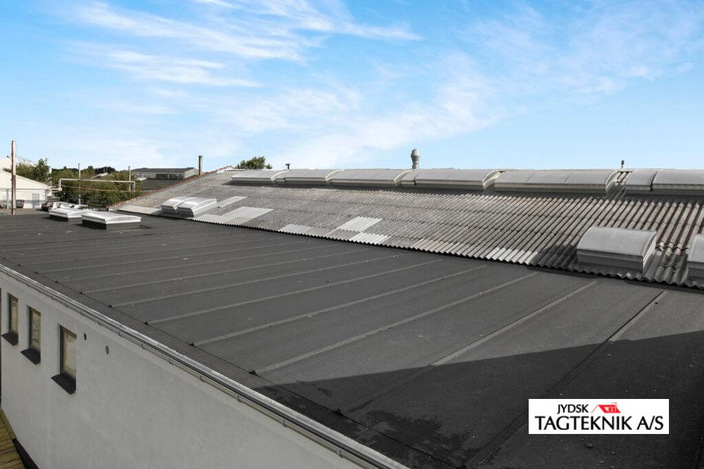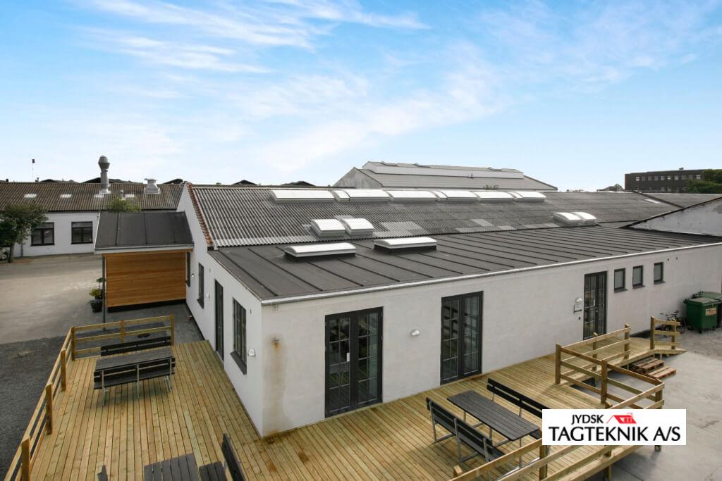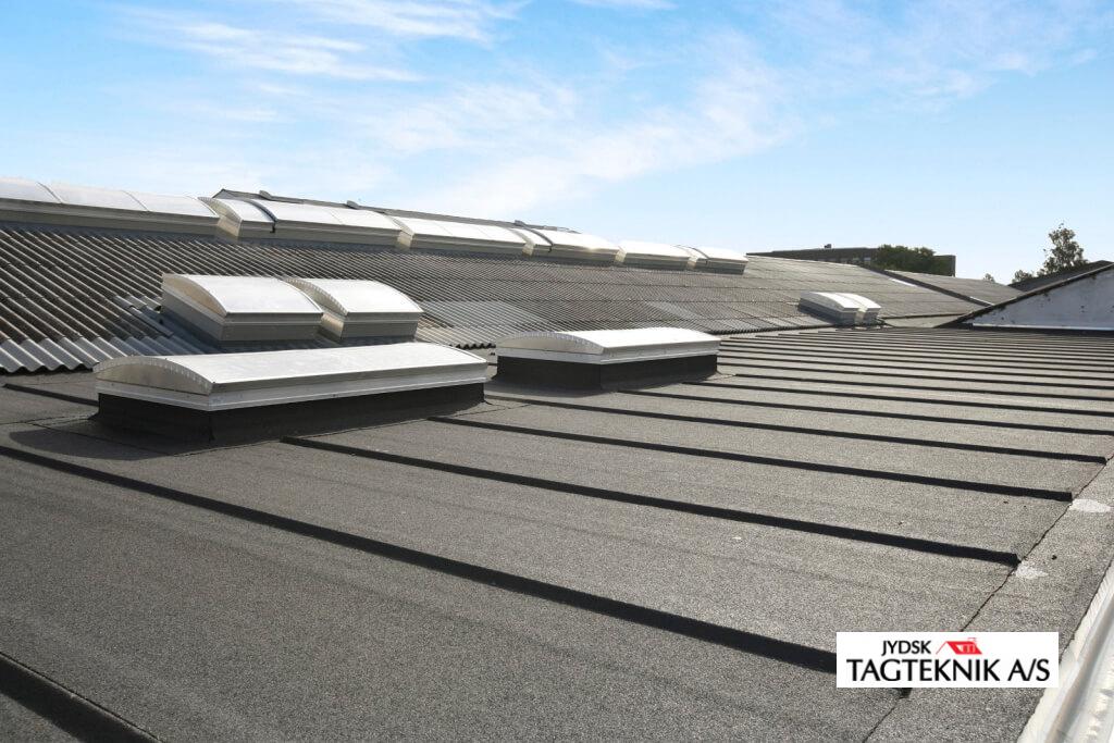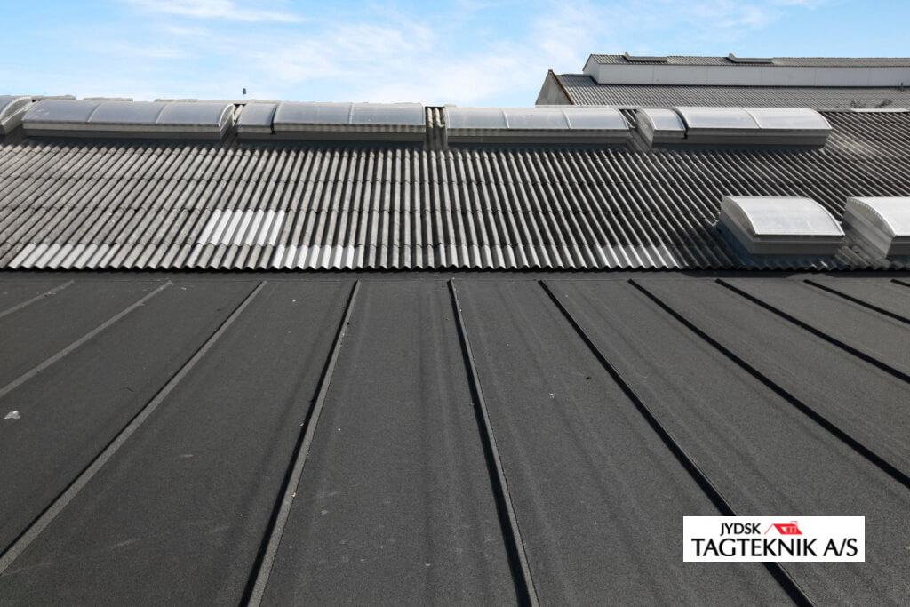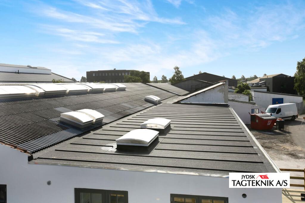Nyt tagpap med lister på lagt erhvervs bygning i Køge, nye ovenlysvinduer blev monteret.