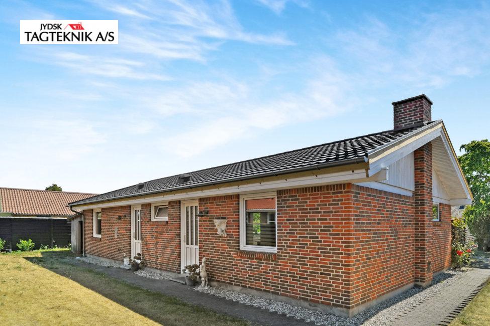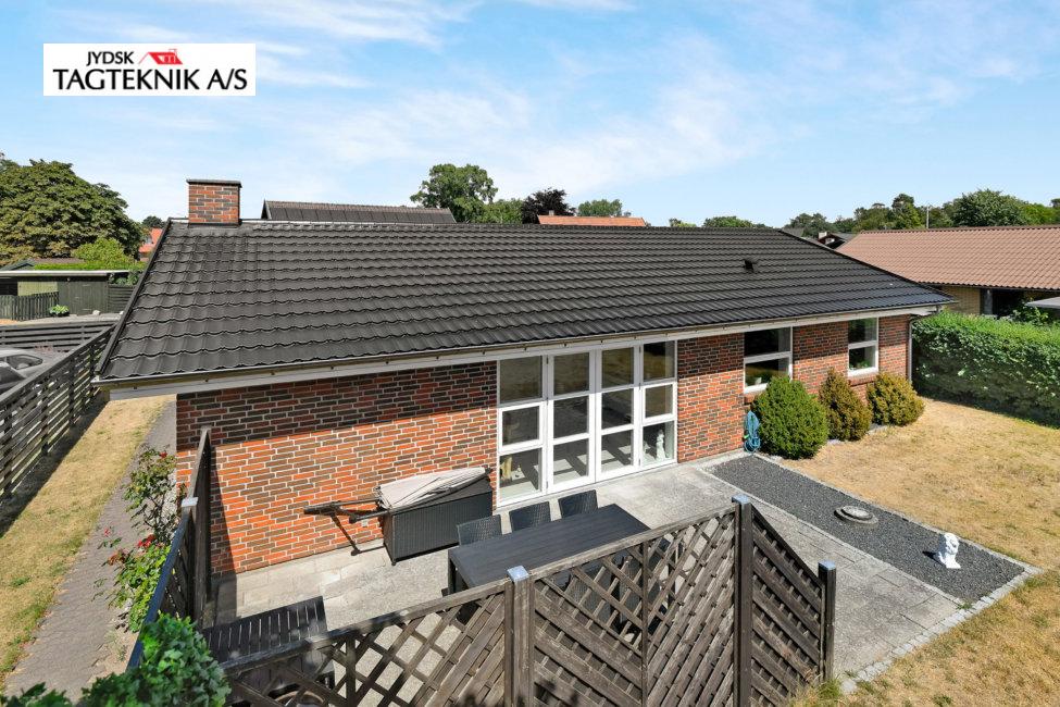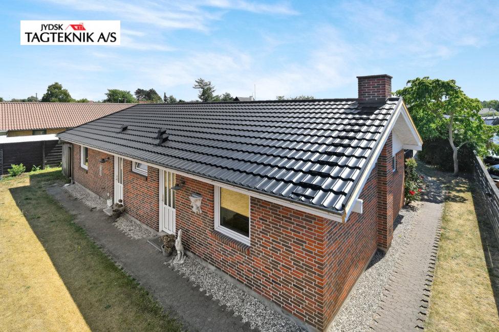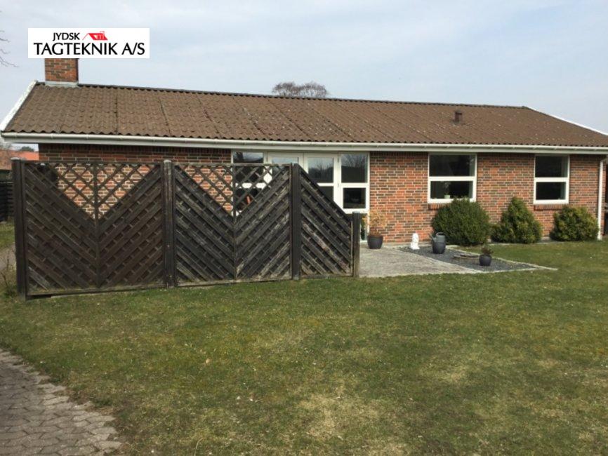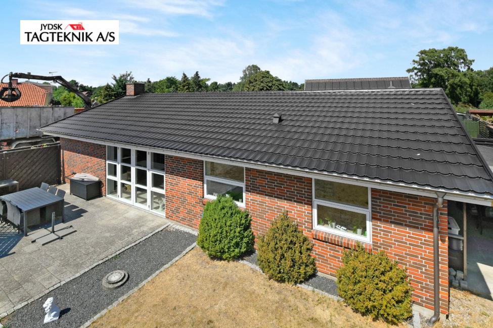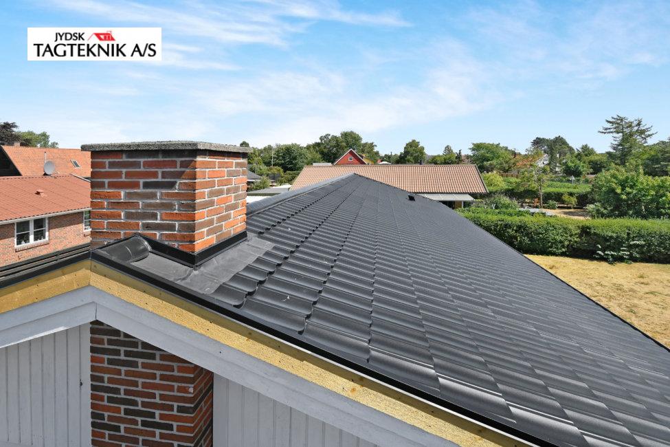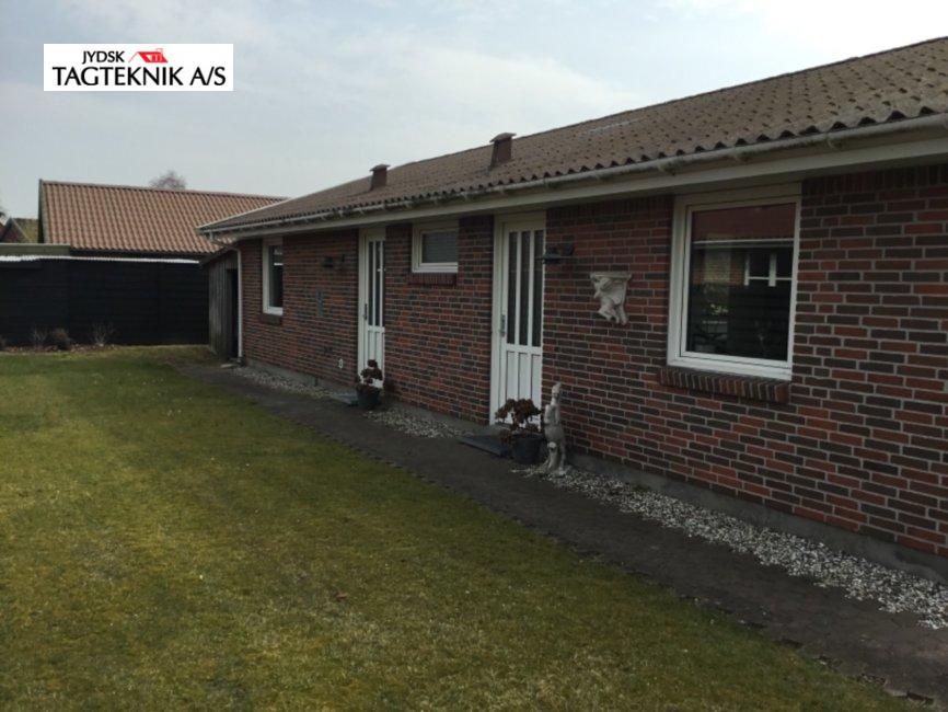 Det nye Decra tag blev monteret ovenpå det eksisterende eternittag, og der blev samtidig monteret nye metaltagrender.