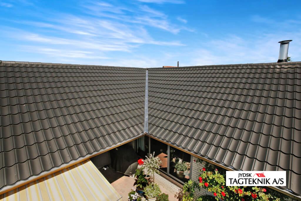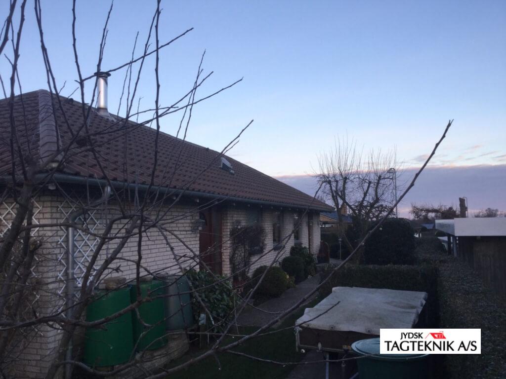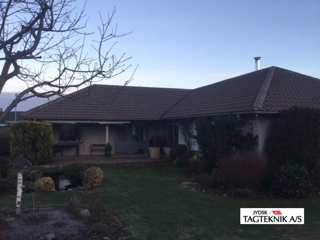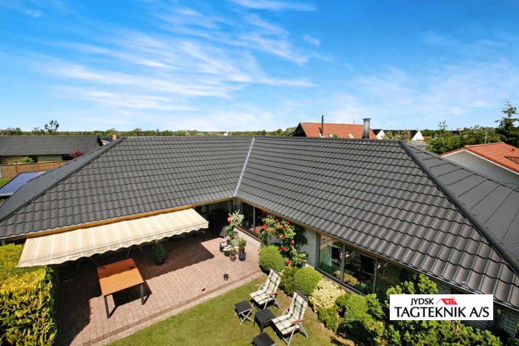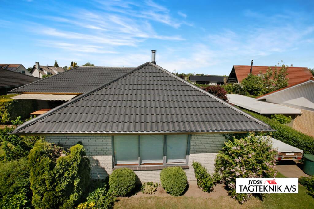 Gammelt betontag blev nedtaget, Nyt Decra Elegancetag i farven Grafit grå blev monteret på villaen i Taastrup, villaen gik også monteret nye metal tagrender.