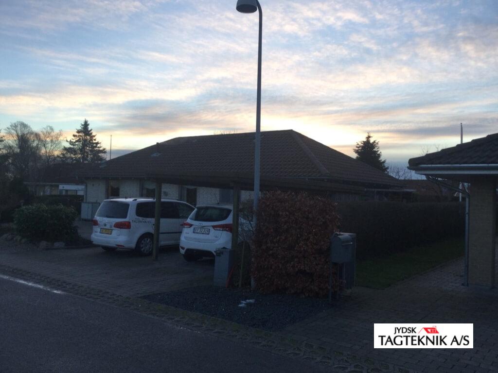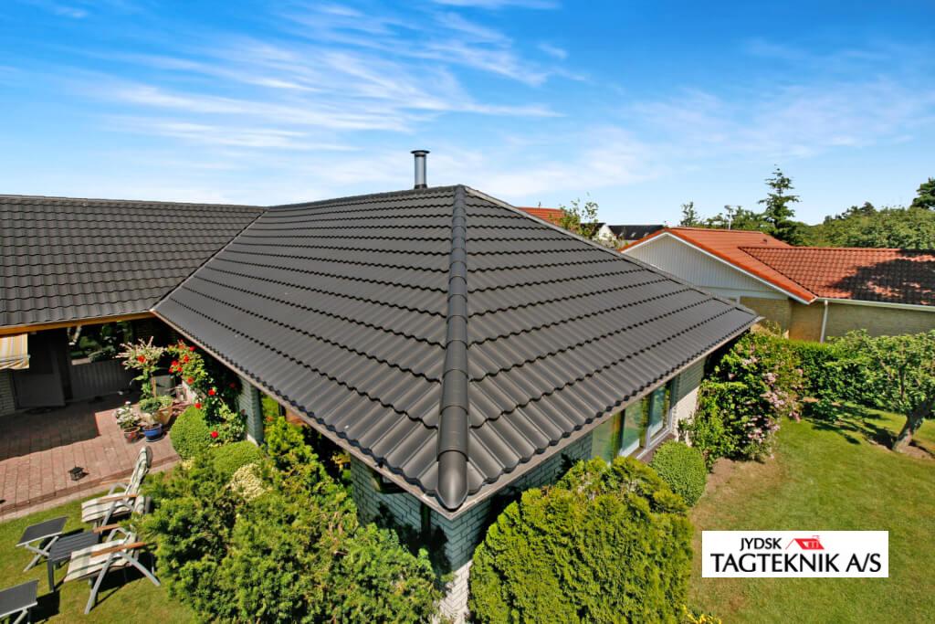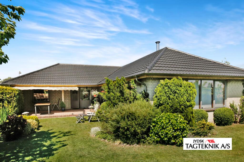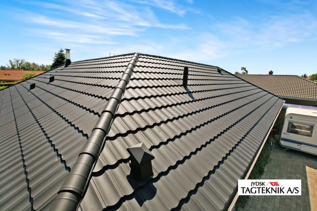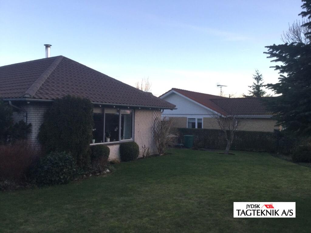 Gammelt betontag blev nedtaget, Nyt Decra Elegancetag i farven Grafit grå blev monteret på villaen i Taastrup, villaen gik også monteret nye metal tagrender.