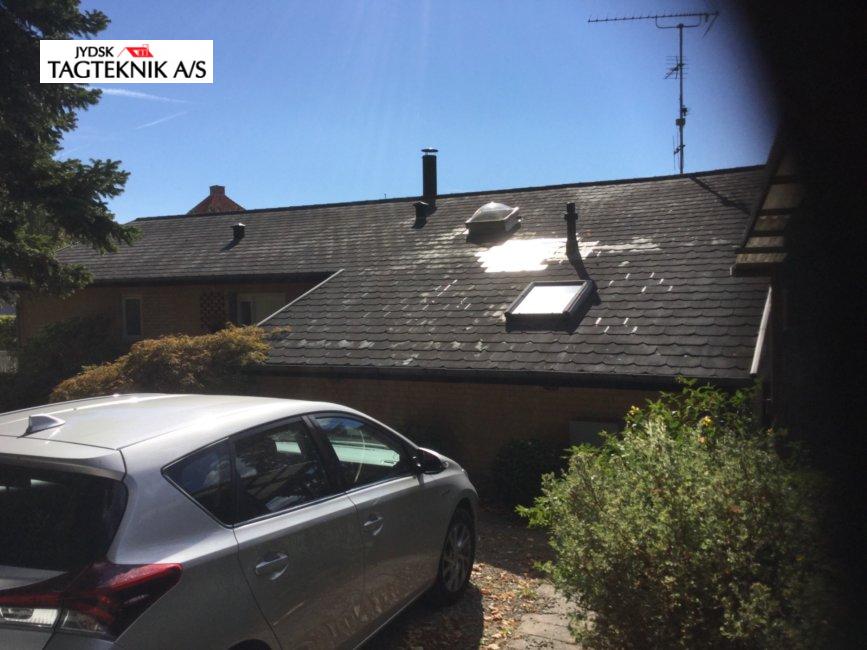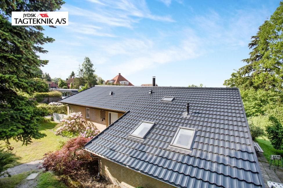 Denne fine villa fik fjernet det gamle skifereternittag, og lagt nyt mat sort Decra Elegance tag.
