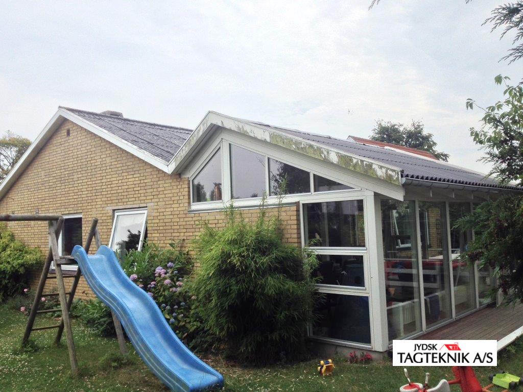 Parcelhuset i Nykøbing Falster fik lagt Decra Classic ovenpå det eksisterende bølgeeterenittag. Derudover er der også monteret nye alu-zink tagrender og nye træbeklædning. Hele hele opgaven blev klaret på 3 arbejdsdage.