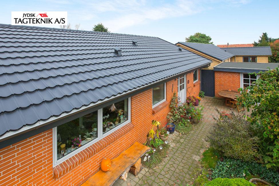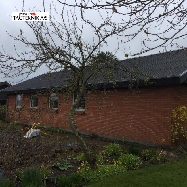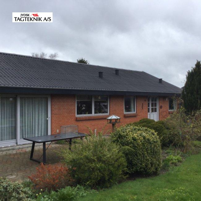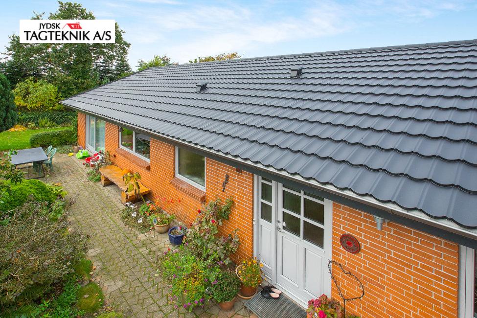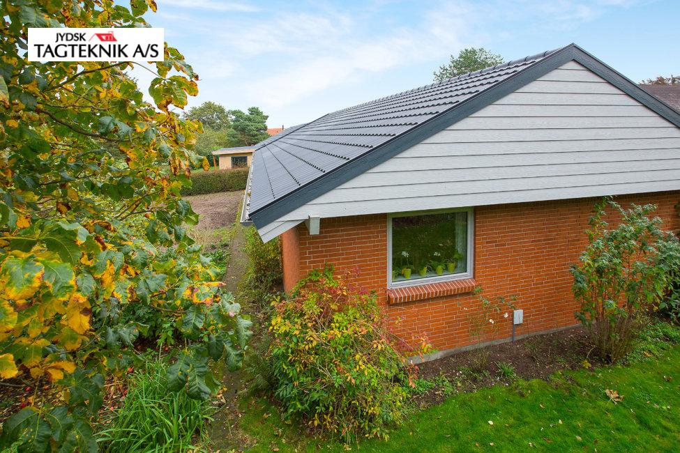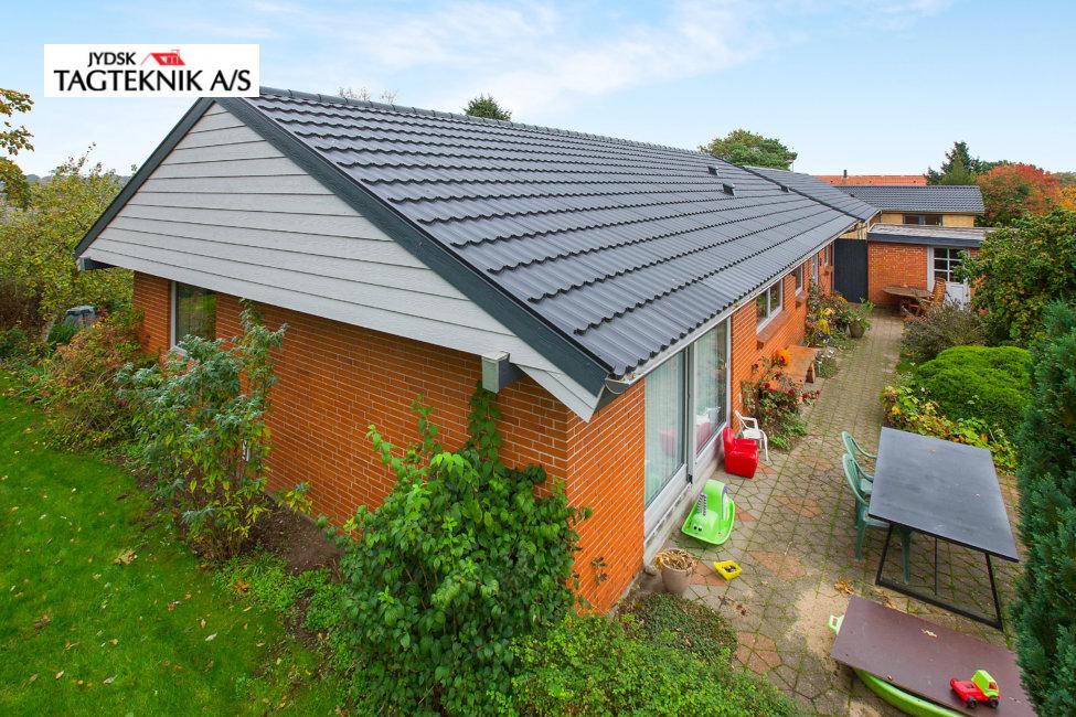 På denne villa i Rødkærsbro, lagde vi nyt Decra tag. Vi monterede også vedligeholdelses frie sternbrædder og vindskeder. Tagrender blev i samme ombæring lavet fra skjulte til synlige.
