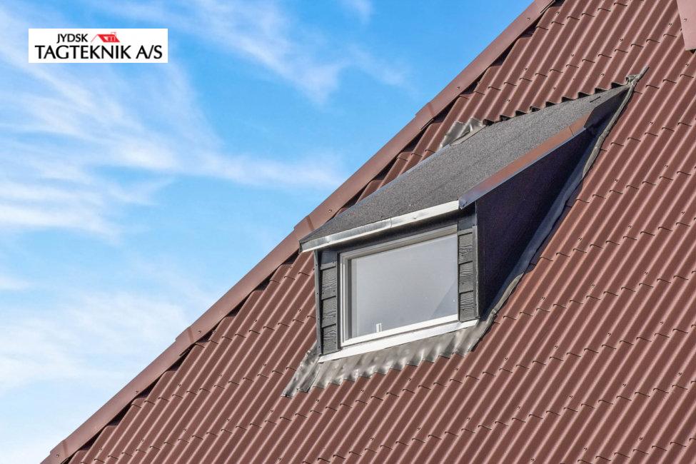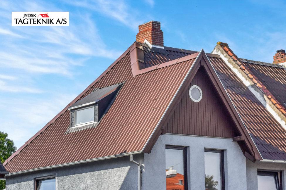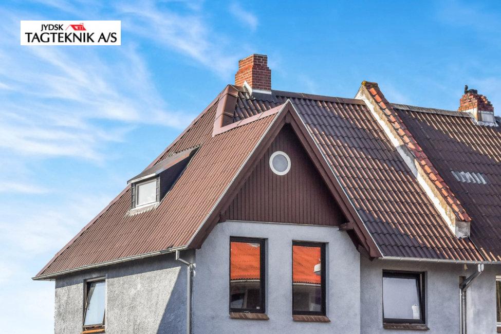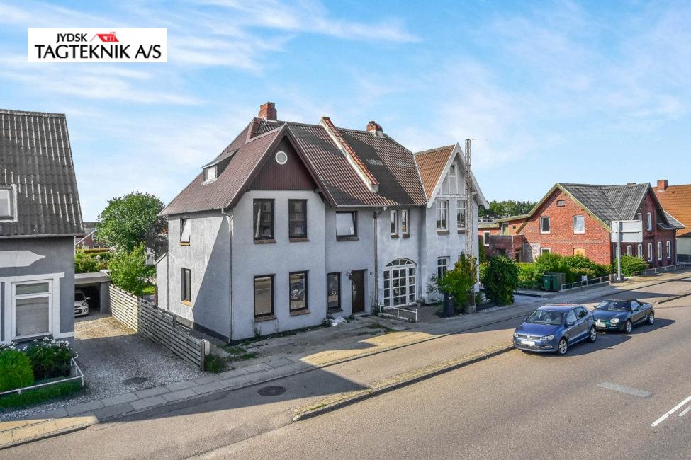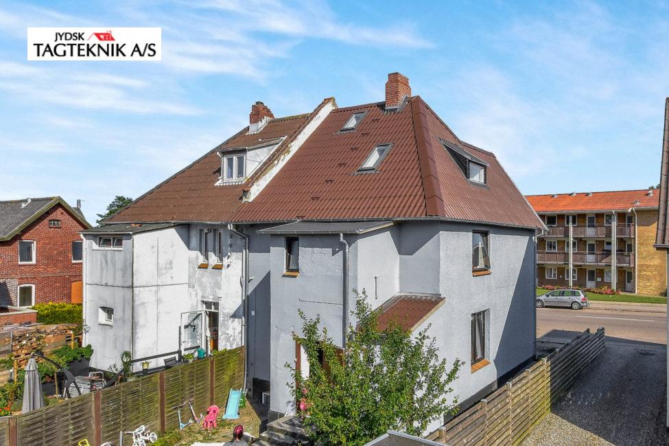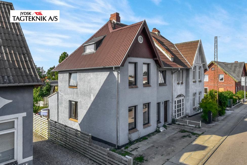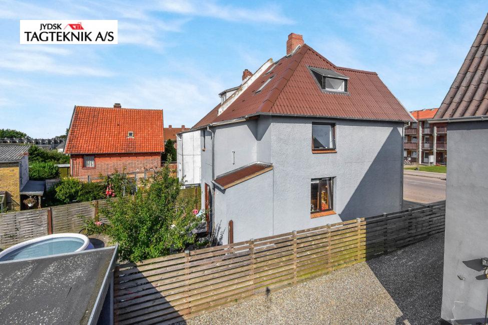 Dette fine dobbelt hus fra Sønderborg, fik lagt nyt B7 Eternit tag. Vi monterede også 3 nye Velux vinduer og reparerede skorstenen. Zink tagrenderne er også helt nye.