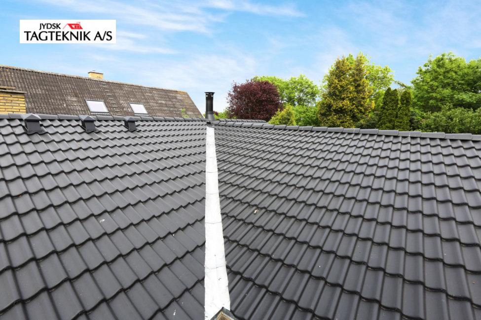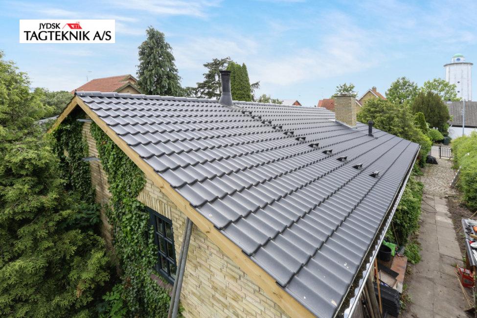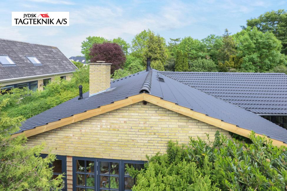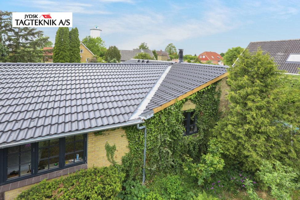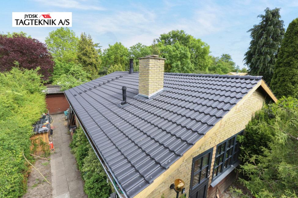 På denne villa i Hvidovre fjernede vi det gamle eternit tag, og lagde nyt B&C Let Betontegl. Zink Skotrender og tagrender er ligeledes nye.