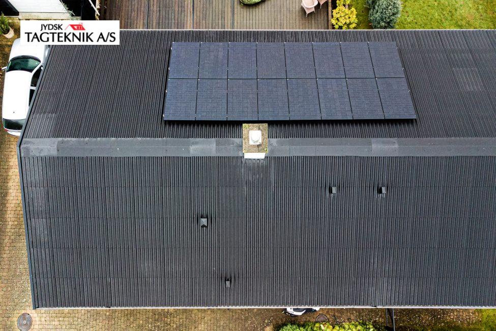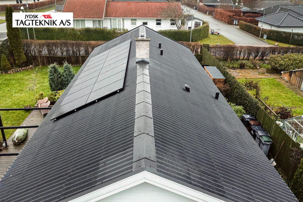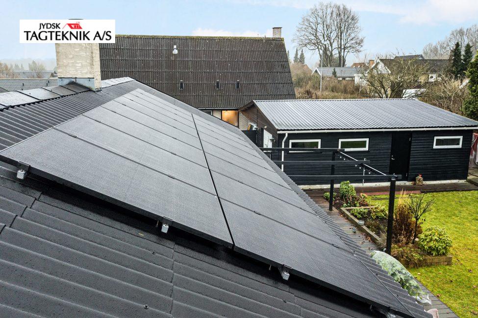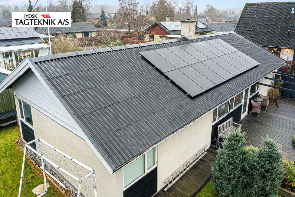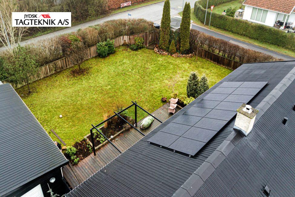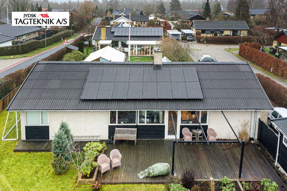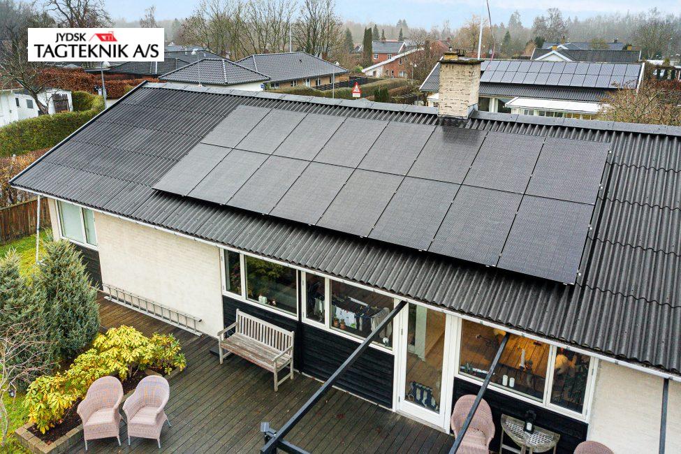 Jydsk Tagteknik A/S har leveret og monteret et 6,4 kWp solcelleanlæg inkl. inverter i Hillerød. Anlægget indeholder: • 16stk Soluxtec Modul Mono XSC Solar paneler på eksisterende bølgeeternittag . 3,2 mm tempered ARC (Anti-reflective Coating) • 1stk Huawei sun2000-4KTL-M1 hybridInverter (13,5A) inkl. Mpp-trackere • Inkl. Kabler, beslag og montering. • Inkl. Smartphone App, El-installatør og ændringer i el-tavle Kabeltræk. EL-installatør anmeldelse og fysisk tilslutning i tavlen.