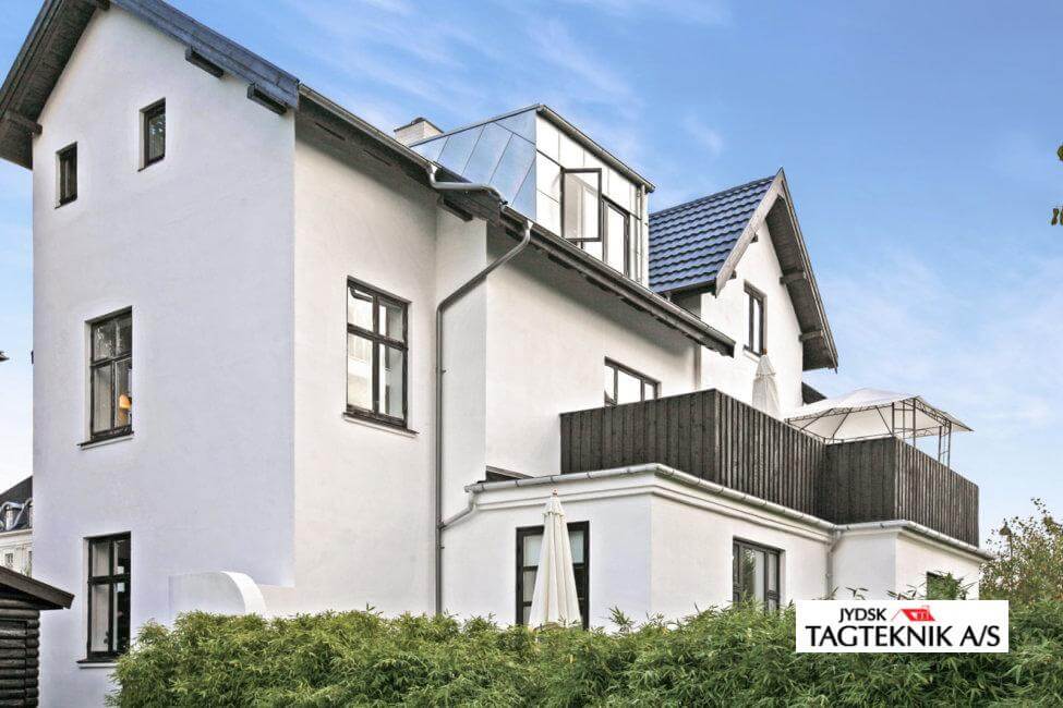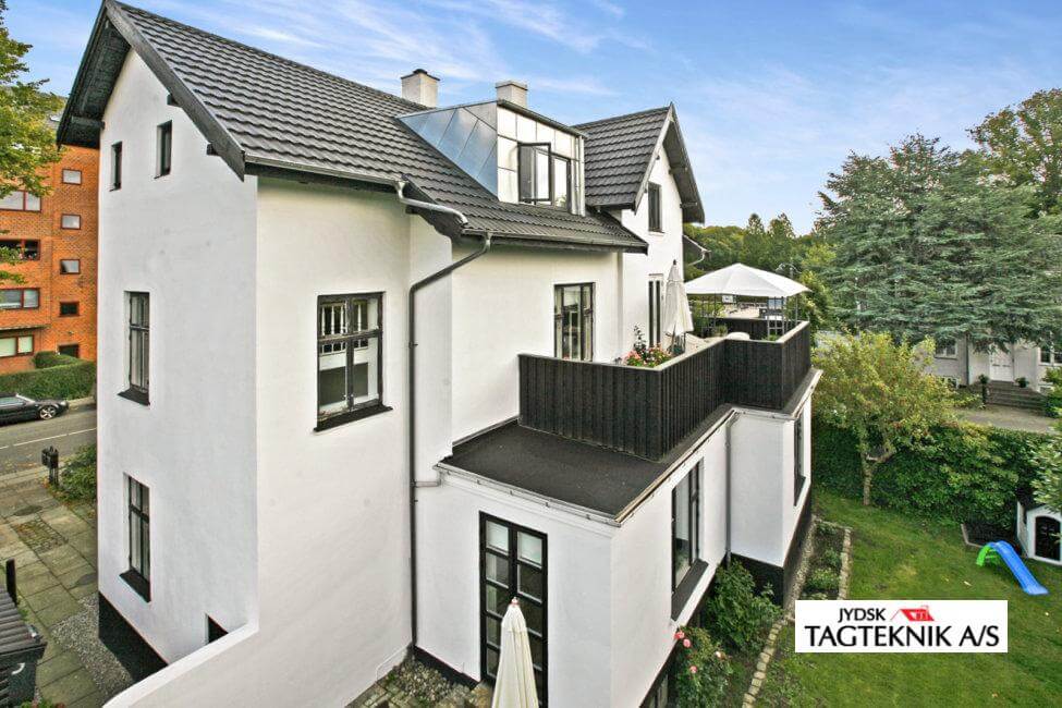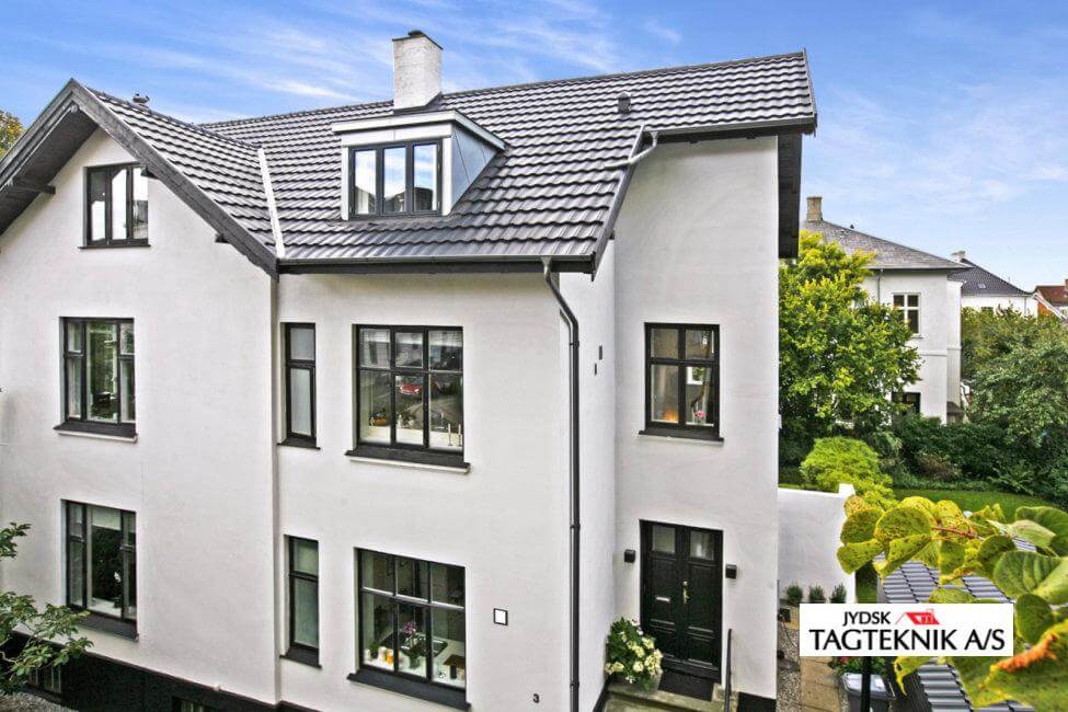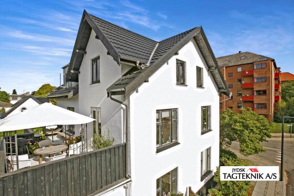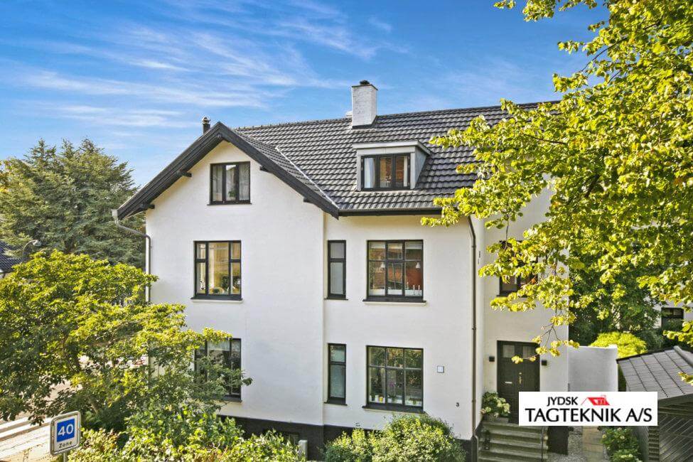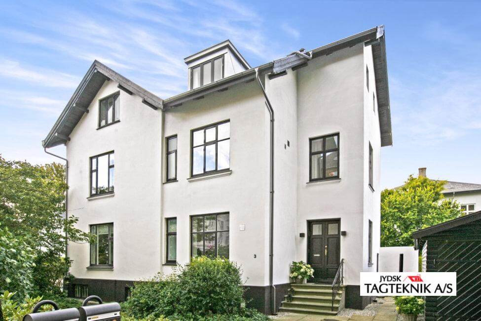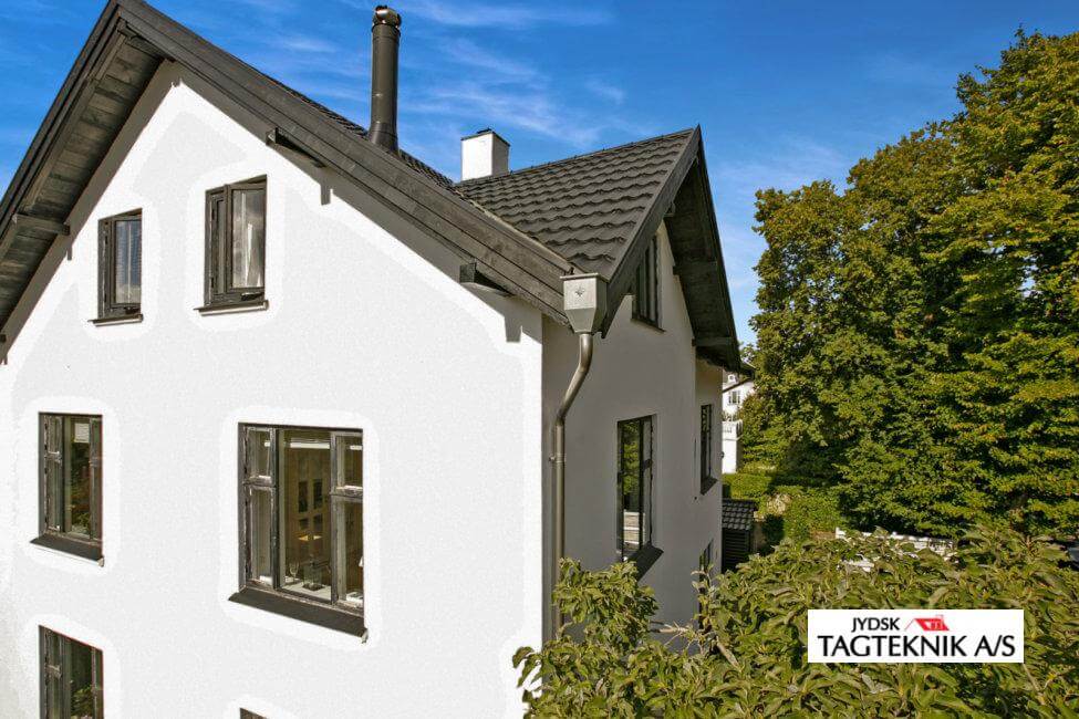Ejendommen i Charlottenlund fik udskiftet det gamle eternittag med et nyt Decra Elegancetag.  der blev også monteret en ny kvist, samt nye metaltagrender .