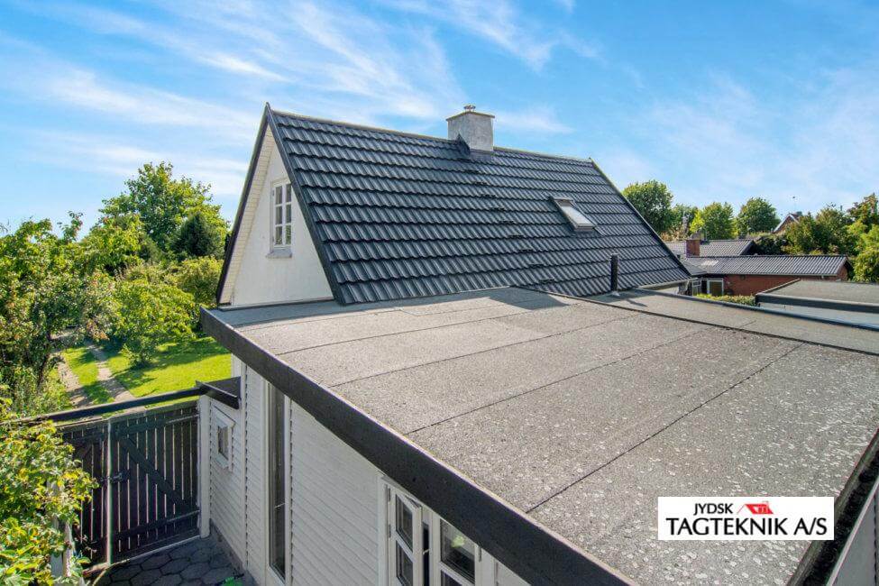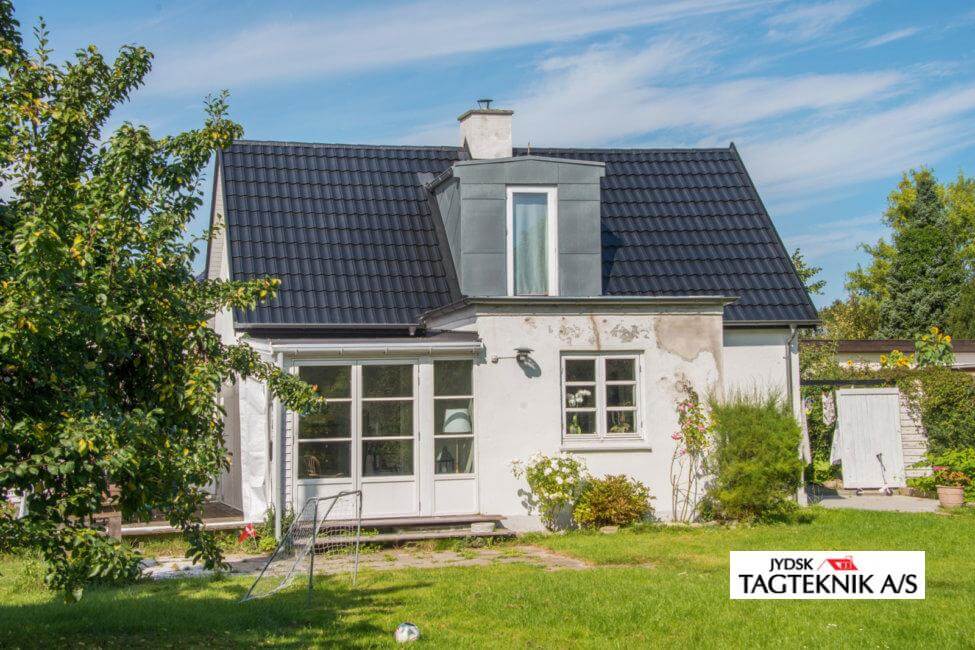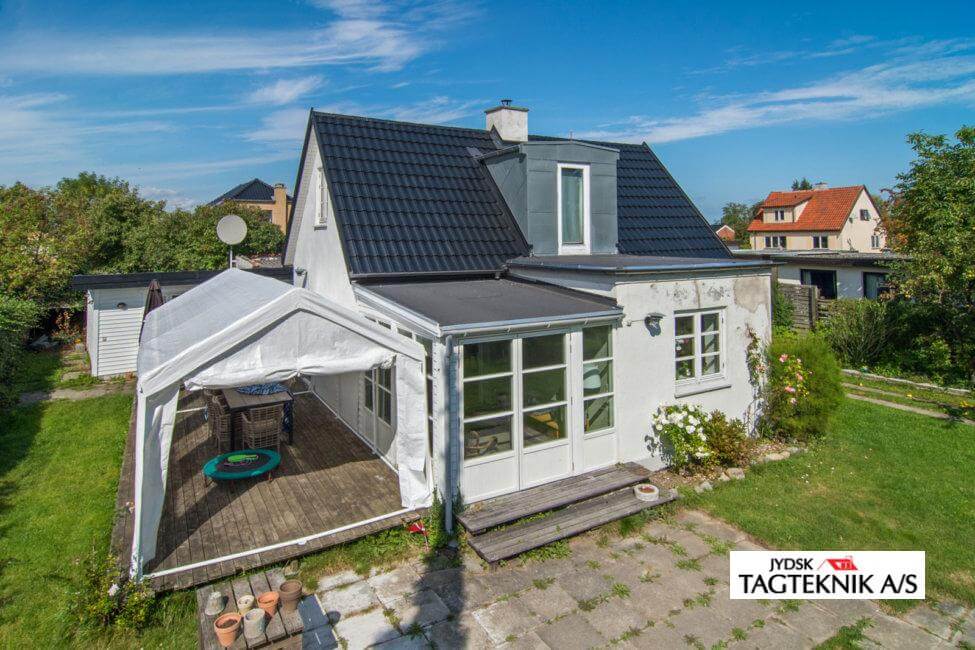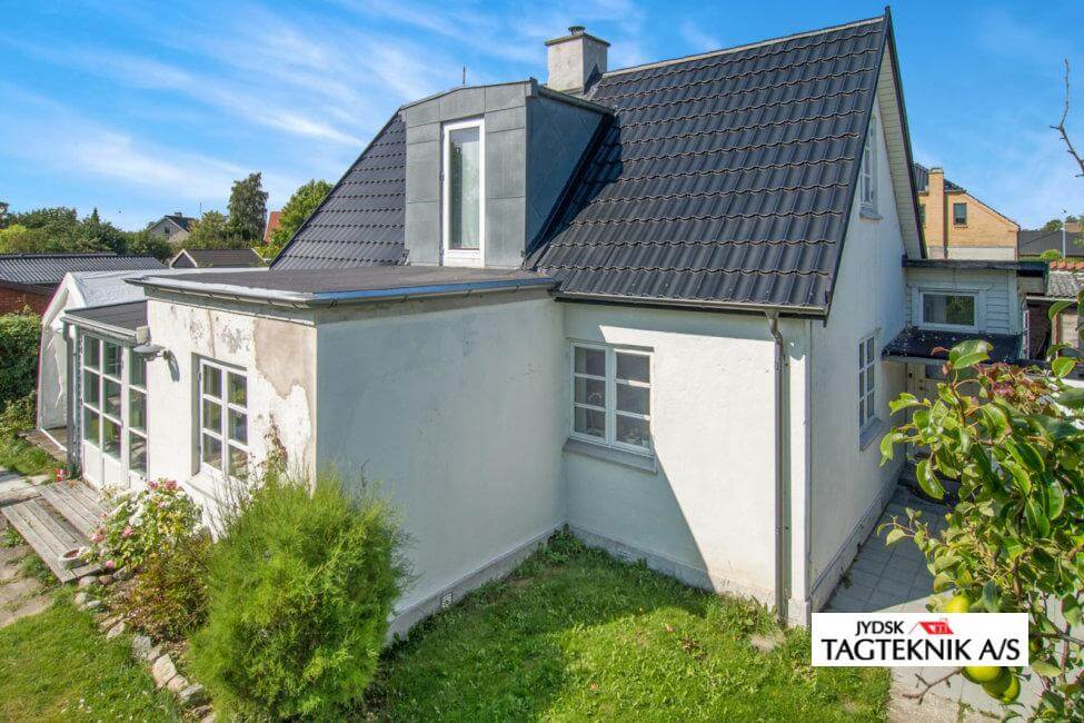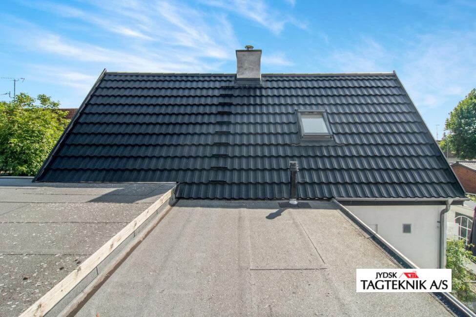 Villaen i Hvidovre fik udskiftet det gamle tegltag med et nyt Decra Elegancetag. huset fik også nyt tagpap på de fladetage, samt montering af ny kvist og velux vinduer.