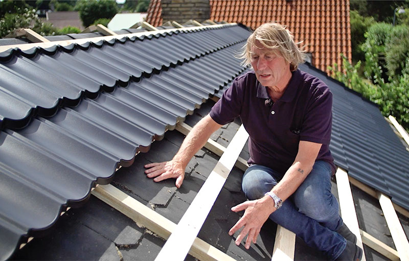 Nyt Decra tag lægges ovenpå et ældre tag af skifereternit.