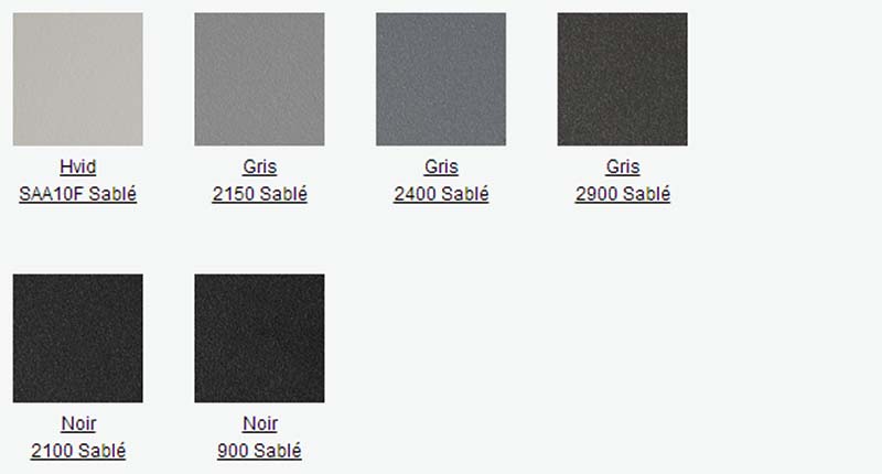 Vi garanterer ikke for farveægtheden i de viste farveeksempler. Du anbefales derfor at benytte et autoriseret RAL-farvekort for valg af den ønskede farve.