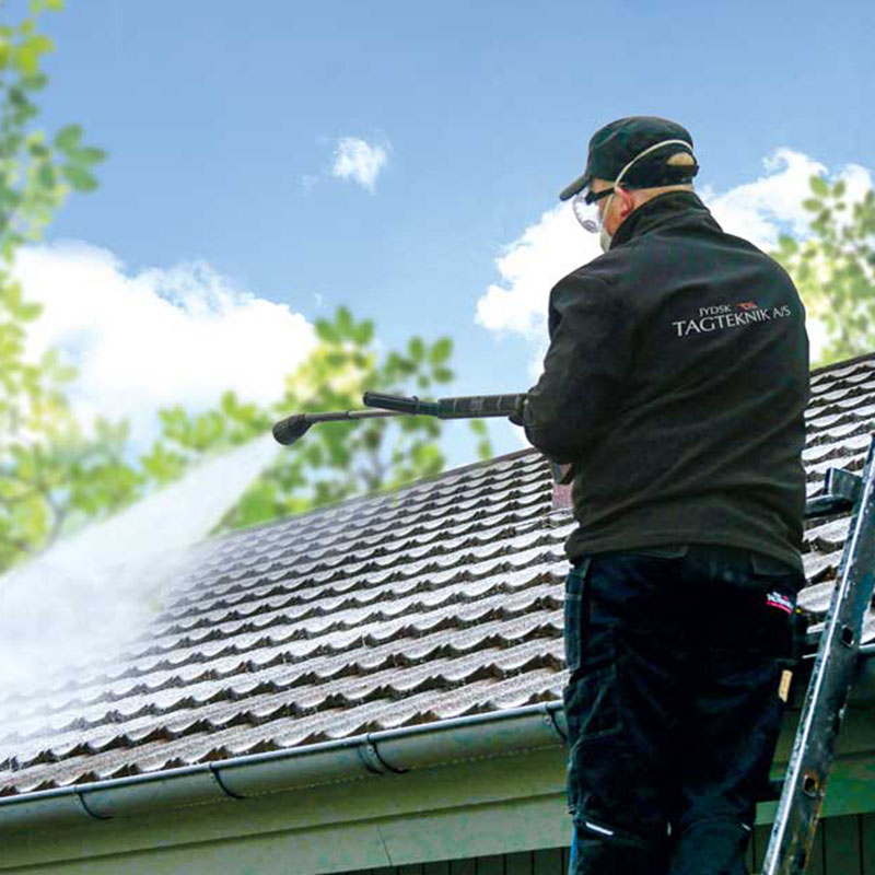 Jydsk Tagteknik er et prisvindende tagfirma, der med professionel og kyndig ekspertise kan stå for algerensningen af jeres tag. Vi behandler taget med et miljøgodkendt algebekæmpelsesmiddel, som vi sprøjter på tagfladen med en lanse. Vi bruger et specialbygget anlæg, der suger overskudsvæsken fra tagrenden og sender den ud i tanken igen. På den måde opsamler vi al overskudsvæsken, der derefter renses og genbruges i processen. Sådan sikrer vi os, at vores algebehandling er så miljømæssig optimal som muligt, hvilket også gør vores proces enestående i branchen.